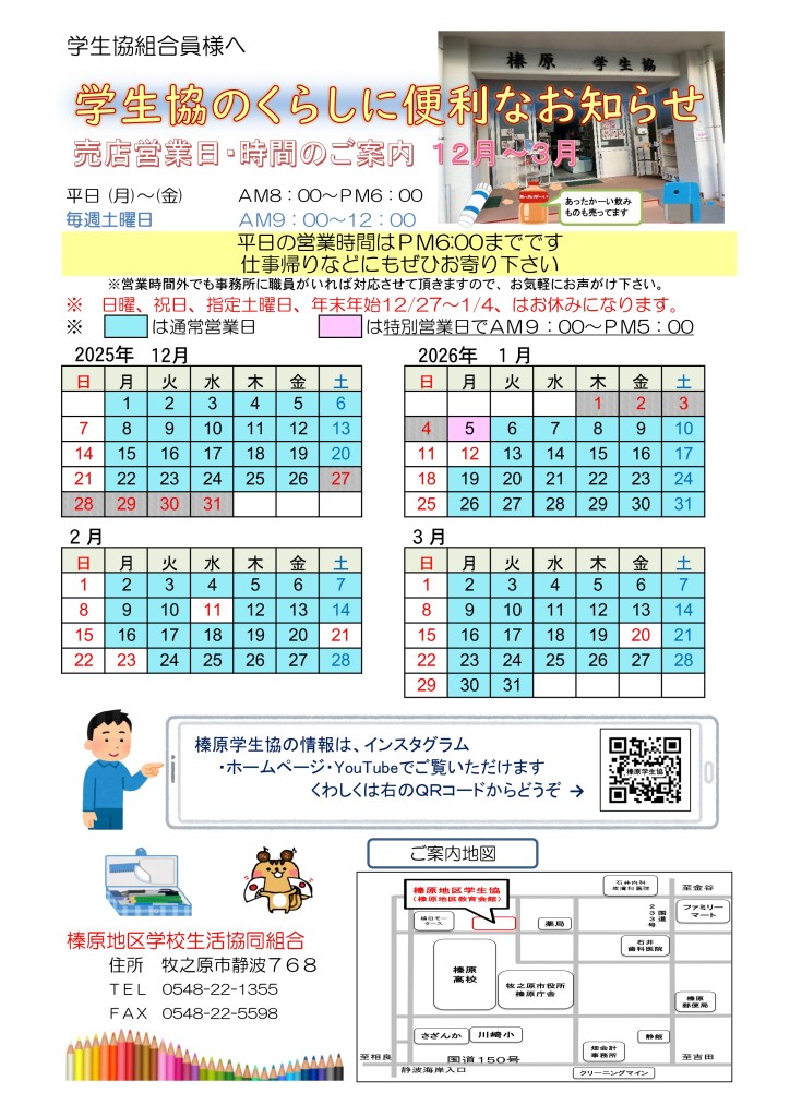 2025年12月~2026年3月の 売店営業日・営業時間のお知らせ 拡大表示 住所:〒421-0422 牧之原市静波768番地 TEL:0548-22-1355FAX:0548-22-5598営業時間:8:00~18:00土曜日は、毎週9:00~12:00休業日:日曜日・祝日 榛原学生協は、国の指導に従って7月1日よりレジ袋を有料化とします。1枚5円です。これは、国が示している地球環境温暖化や廃棄物・資源制約、海洋プラスチックごみ等の課題に賛同するものであり、榛原学生協もレジ袋は極力使わないようにしますので、ご来店の際は、エコバック等ご持参くださるようご理解のほどよろしくお願いいたします。