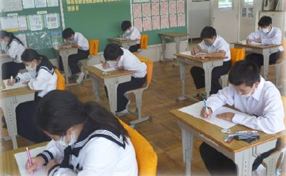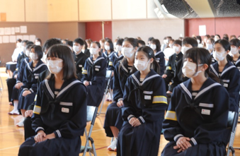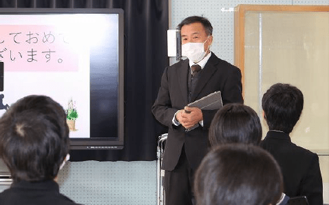 1月6日に3学期がスタートしました。オンラインで行った始業式では、3名の代表者が力強く新年の決意を発表しました。上記写真は、校長先生のお話とそれを集中して教室で聞く生徒の様子です。もう一枚の写真は、2年生の進路講話の様子です。2年生は、相良高校の副校長先生と代表生徒2名をお招きして進路講話を行いました。高校入試の仕組みや高等学校の魅力などについてお話を伺うことができ、進路に対する意識を高める貴重な機会となりました。