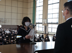 4月6日に始業式、入学式を行い令和4年度が力強くスタートしました。始業式の山下校長先生の式辞では、「今年は、『輝く自分』をつくる生徒 自ら磨く、共に磨く、という重点目標で教育活動を行うこと」また、「『自ら磨く』とは、『工夫したり、必死に努力したり、弱い自分と戦ったり』『小さなことであっても、努力して成し遂げたり』することを積み重ね、自己を伸ばし続けること」の大切さを話されました。また、「『共に磨く』とは一人ではくじけてしまいそうなことも、他と競り合い、励まし合うなど、切磋琢磨しあうことで自らを高めていく。」このことの大切さも強調されました。