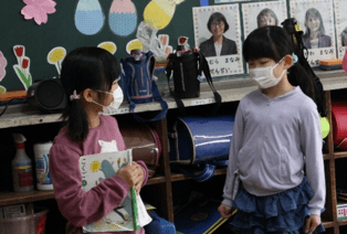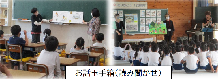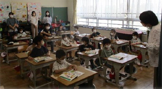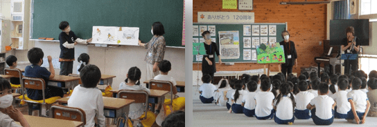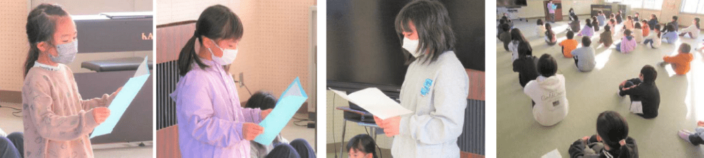 上記写真は、これまでお世話になった学校ボランティアの皆様に感謝する会の写真と「ブックママ 読み聞かせ」の写真です。感謝する会では、コロナ禍で全校が一堂に会することはできませんでしたが、オンラインで教室を結び、学校ボランティアの皆様と子供たちが画面を通してつながることができました。その後、5,6年生の有志で「ソーラン節」のプレゼントをしました。