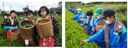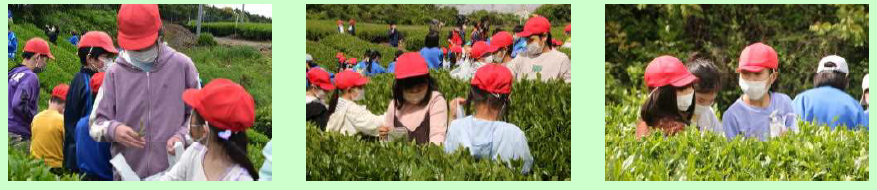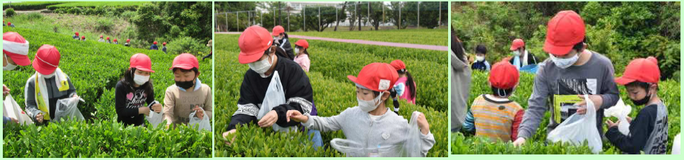 上段の写真は、牧之原中学校恒例の学校園での「お茶摘み」が行われました。お茶摘みは、全校生徒と牧之原小学校児童、牧之原保育園年長児童で行いました。