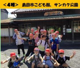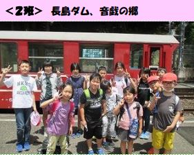 上記写真は、「なかよしスクール」の写真です。全校児童を縦割り集団にして6年生が活動の企画・運営を行いアイデアいっぱいの活動を行いました。1班は、奥大井湖上駅・音戯の郷へ。2班は、長島ダム・音戯の郷へ。3班は、島田市中央公園・バラの丘公園へ。4班は、島田こども館、サンカク公園へ。それぞれ行きました。また、4~6年生は宿泊体験も行い、さらに思い出ができました。