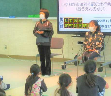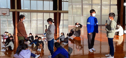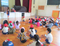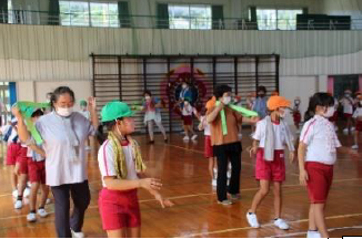 地頭方小学校の6年生は、劇を通してあいさつの大切さを呼びかけました。(上記写真左)劇では、「声が小さい」とか「はずかしい」などそれぞれ理由は違いますが、あいさつをしたのに返ってこないと、相手は悲しい気持ちになるということを子供たちは知りました。あいさつを返せない場合は、会釈などでもいいから、自分の思いを伝えていこうという気持ちを持つことができたと思います。上記写真の右側は、1年生から3年生が運動会の団体演技で「牧之原音頭」を踊るにあたって地域のボランティアの方たちに踊りを教えてもらっている写真です。