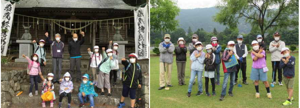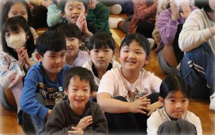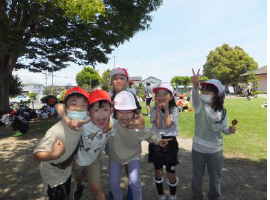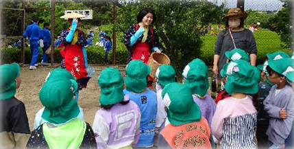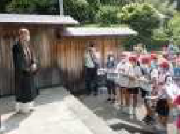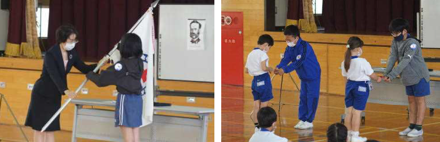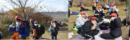上記写真左は、4月に入学した1年生を全校で歓迎し、早く仲良くなるための会「はじめましての会」を開きました。お昼は、縦割りグループで、運動場、一幡神社、西山寺に分かれてお弁当を食べました。