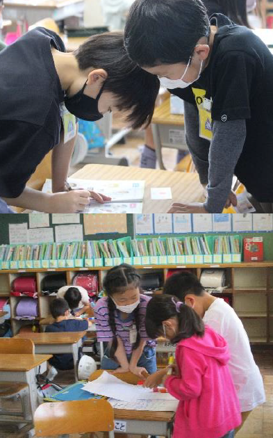 1年生18人が、4月いっぱい下校ボランティアの皆さんに引率していただき一緒に帰っていただきました【写真左】。また、「はじめましての会」を行い【写真右】、1年と6年、2年と5年、3年と4年のペア活動も始まりました。