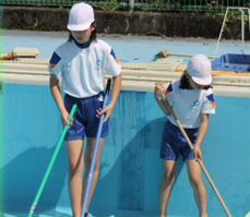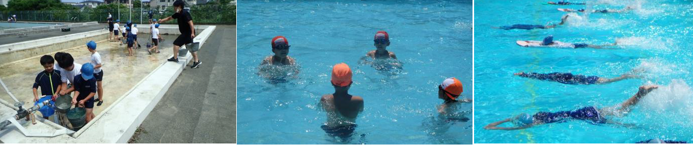 上記写真は、2年生の劇団ファイブによる音読を、1年生と3年生に披露しているところと6年生の授業で自分の「?」をすっきりさせようと友達の考え方を真剣に聴き自分の考えと比べているところです。また、プール清掃の写真は、自分たちでこれから使うプールをきれいにしているところです。