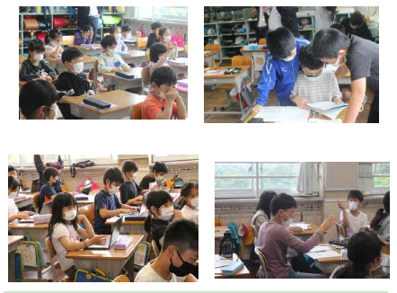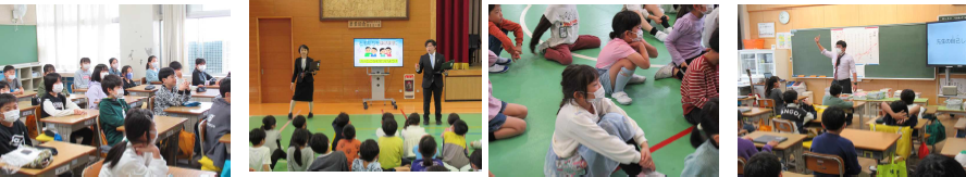 上記写真は、「授業を見合う会」「読み聞かせ」「水泳の授業」の様子です。「授業を見合う会」は、理想の授業イメージをもったり見た授業のよさを伝えたりすることを通して、より対話的で深め合う授業に取り組めるよう進めています。