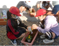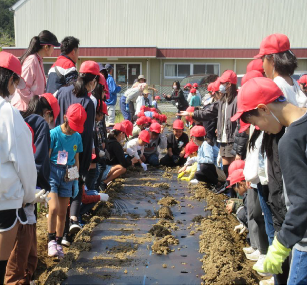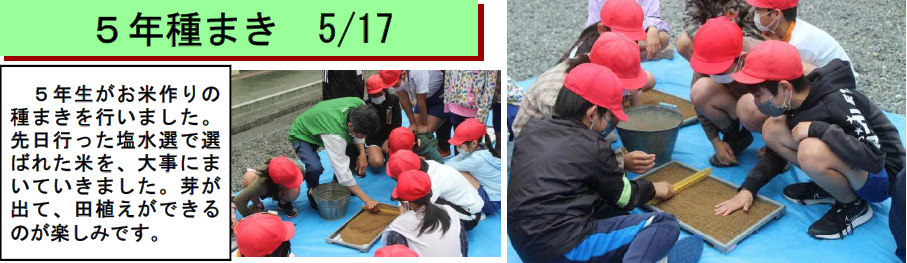 今年度も中地区の浅野精一様(学校運営協議会委員)と奥様の依子様の御指導により、4月11日に全校児童でトウモロコシの種植えを行いました。「まず、指で穴をあけてから種をまくよ。」「そうっと土をかぶせてね。」…6年生が入学したばかりの1年生にトウモロコシの種の植え方を優しく教えています。【写真左】