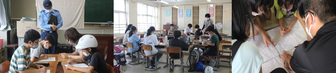 様々な体験活動などを通して子どもたちは学び、成長しています。(左:1年生家庭教育学級・起震車体験、中:3年生消防署見学、右:6年防災学習「逃げ地図づくり」)