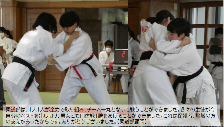 中体連志太・榛原大会の様子から。女子柔道部は、団体戦で2位となり県大会に出場が決定しました。また、校内にある「ソフトテニス部」「野球部」も大会に参加をしてベストを尽くしました。応援ありがとうございました。