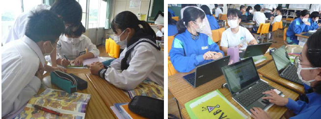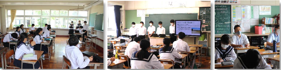上記下段の写真は、1年生の防災体験学習の写真です。1日目は、防災講話(中部電力)、グループ別体験学習(相良原子力防災センター施設見学、大江いのち山公園見学と炊き出し訓練、起震車体験、防災救助犬についての講話・見学等)を行いました。2日目は、災害講話(東北大学講師)、グループワーク「減災行動プランの作成」、グループワークのまとめと発表を行いました。3日目は、防災学習のまとめとして、新聞づくりと発表会を行いました。