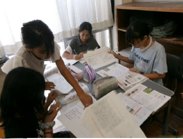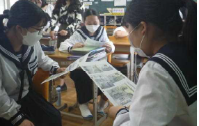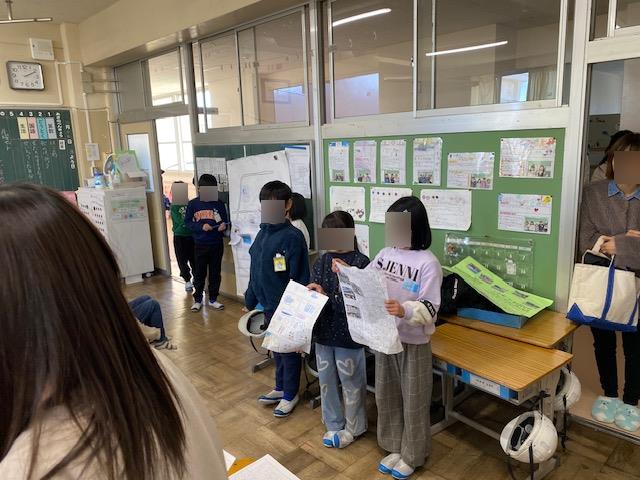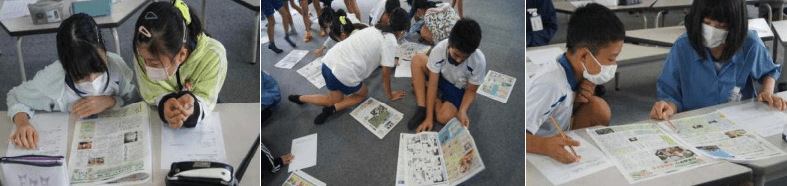 もう一つの上記写真は、6年生が取り組んだ「NIE授業」の様子です。NIE授業とは、新聞を活用した授業のことで、萩間小学校は昨年度から取り組んでいます。5年生が授業参観に来たのですが、いつの間にか一緒になって授業を楽しんでいました。