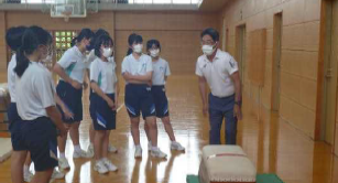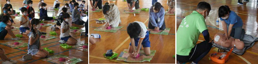 菅山小では水泳授業を前に消防署の方をお招きし5年生が救命救急法を学びました。【写真左】また6月下旬には交通安全リーダーと語る会を行い、5・6年生とPTA、警察署、市危機管理課、交通指導員の皆さんと意見交換をしました。【写真中央】7月には祖父母の会の皆さんが前庭や運動場などの草刈りや草取りをしてくださいました。【写真右】