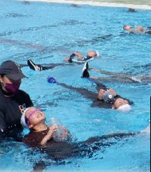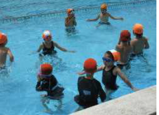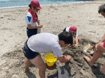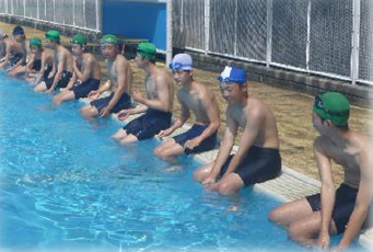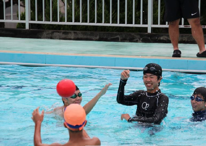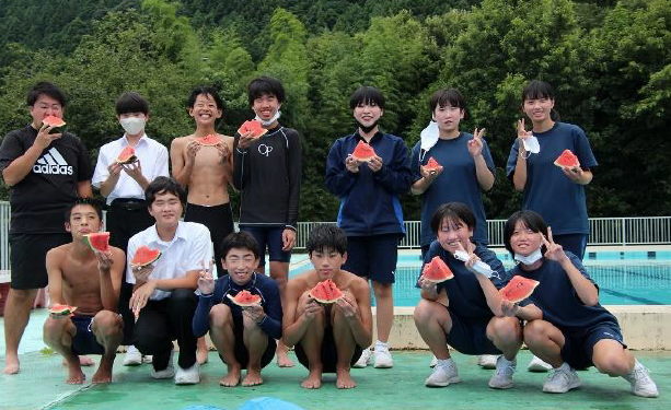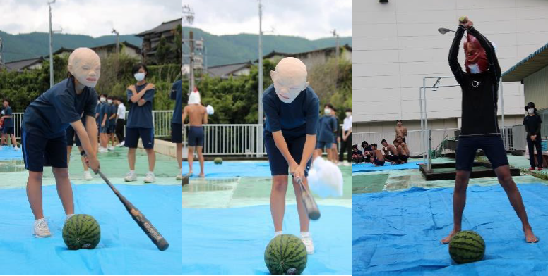 上記写真は、夏休み中の8月8日に行った「本中サマーフェス」の様子です。プールでのレクレーションとスイカ割りをして職員と生徒が交わって楽しみました。