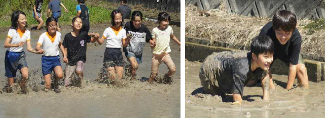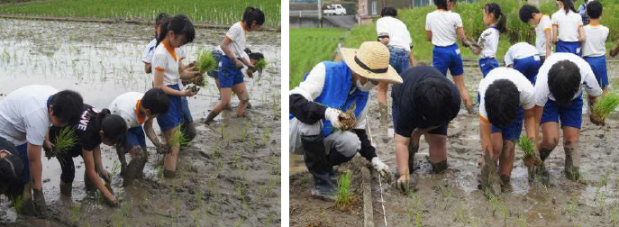 上記写真は、「5・6年生の救急法講習会 職員救急法研修」「5年生の代かき・田植え」「保幼小連絡会(1年生の授業参観)」の様子です。5年生の「代かき・田植え」では、泥だらけになりながら、とても楽しそうに代かきを行いました。田植えでは、縦横がしっかり揃うように、一列になって植えていきました。