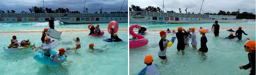 上記写真は、6年生が「「ミライの学校プロジェクト授業」を行った様子です。牧之原市学校再編室も宮部指導主事と『後輩たちにステキな学校をプレゼントしよう!』を合言葉に、義務教育学校の姿を考え発表しました。また、下の写真は、牧之原市危機管理課の皆さんとと4年生が行った防災学習の様子と3年生が見学に行った牧之原市のサーフスタジアムで人工波の体験をしている様子です。