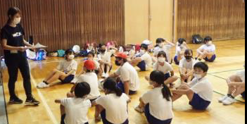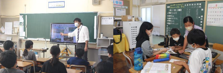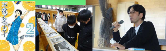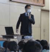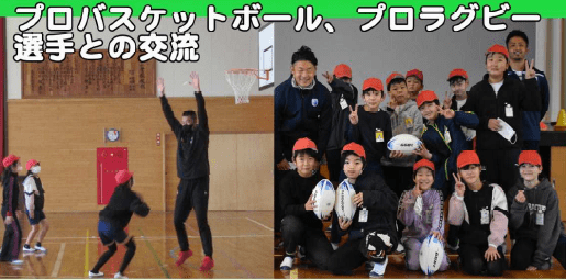 上記写真は、キャリア教育の実践場面です。1つ目の写真は、夢講話として牧之原市出身の漫画家、粂田晃宏さんをお呼びして「夢中を見つけよう!」のタイトルで5,6年生に向け話をしてもらっている写真です。講話後、子供たちからは、「自分が夢中になれるものを見つけたい」と振り返っていました。また、2つ目の写真は、プロバスケットボール選手「三遠ネオフィニックス」とプロラグビー選手「静岡ブルーレヴズ」との交流を5年生が行ったものです。ここでは、プロ選手の練習を体験したり、必要な力について話を聞きました。