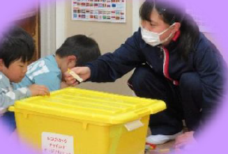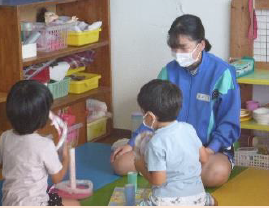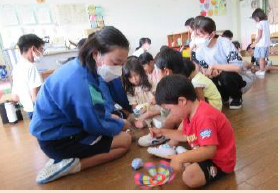 3年生が、家庭科の「幼児の生活と遊び」の学習に関わり、夏休みに各自が作成した「園児が安全で楽しく遊べるおもちゃ」を持参して、牧之原保育園を訪問しました。工夫して作ったおもちゃは、園児たちに大人気で、何度も遊ぶ姿や、生徒と園児が楽しく会話をしながら遊ぶ姿がたくさん見られました。