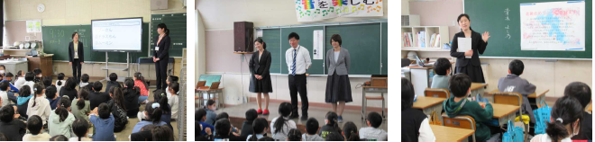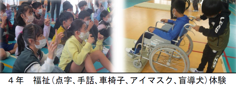 上記写真は、「社会科見学」「読み聞かせ」「福祉体験」の様子です。実際に見学や体験を通して学ぶ授業が各学年で行われました。
