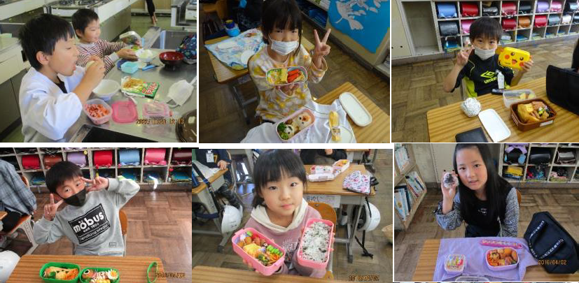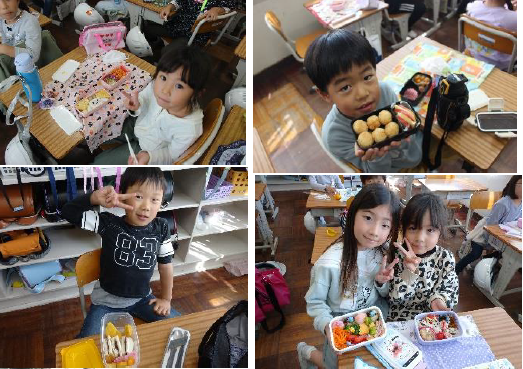 上記写真は、PTAで決めたお弁当の日(10月7日)に合わせて5,6年生のほとんどが自分の力で全てお弁当を作ってきました。普段より早く起きて一生懸命作ったお弁当はとてもおいしかったです。また別の写真は、10月15日に実施した運動会の写真です。スローガン「見ている人もやっている人も涙あふれる思い出の運動会」にふさわしい運動会となりました。
