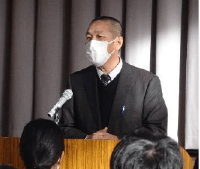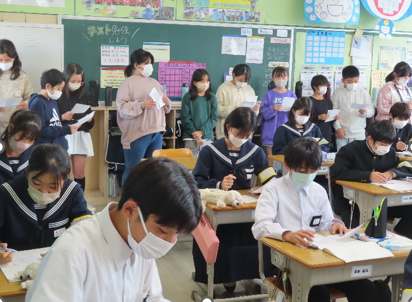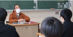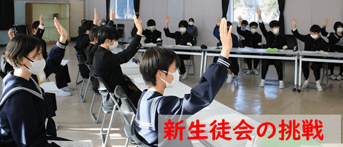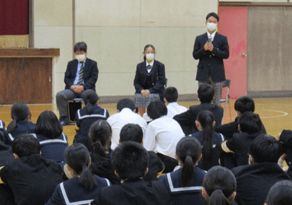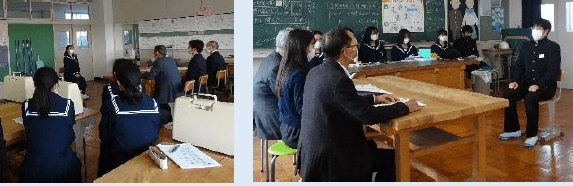 1年生が町の皆さんを迎えて自分の将来を考える機会を持ちました。ヤマメ養殖業を営む梶山さんからは、働くということ、今から意識しておくと良いことなど多くのことを教えていただきました。(上記写真左)また、右の写真は、後期生徒総会の様子です。12月に3年生からバトンを引き継いだ2年生を中心とする新生徒会の初の大きな生徒会行事です。今回の生徒総会では新生徒会の新たな試みとして、席を三角形に設けて実施しました。対面で行うことで一人一人が主体的にかかわることができた生徒総会になりました。