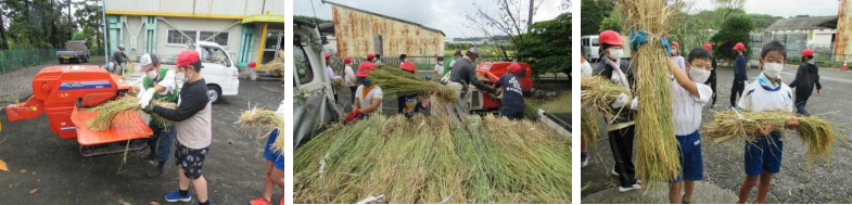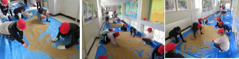 上記写真は、5年生が行った脱穀の様子と脱稿してできたもみをブルーシートを敷いて廊下に干しているところです。今年は例年に比べて収穫量が多かったです。