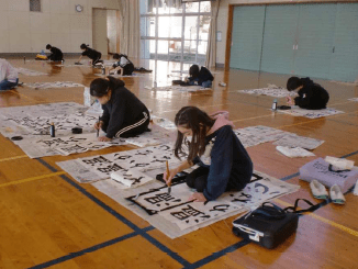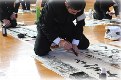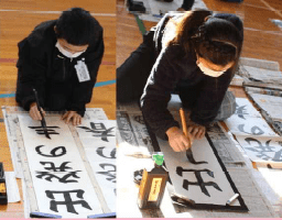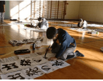 校内書初め大会:書き初め会を体育館にて全校一斉に行いました。体育館の中は朝から冷え切っていましたが、生徒たちは1時間集中を切らさず書いていました。