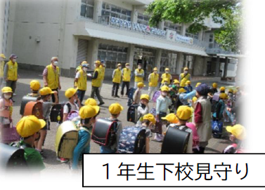 上記写真は、住吉小学校で実施しているコミュニティスクールとしての実践です。左の写真は、1年生の下校見守り隊の方々の様子。中央の写真は、朝のあいさつ運動の様子です。そして、右側の写真は、ボランティアの皆さんの協力によって実施している読み聞かせ(お話玉手箱)の様子です。