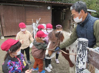上記写真は、1年生が地域で馬を飼育している獣医師の鈴木さんの牧場を訪ね、馬と触れ合っている写真です。子供たちは、「馬は怖いと思ったけど、触ってみたら怖くなかったよ。」「毛がふさふさしていたよ。」などの感想をもちました。その後、馬の絵を写生して帰ってきました。また右2枚の写真は、4年生がヤマハラグビー育成部の小池さん(7人制ラグビー元日本代表)を講師に招いてタグラグビーの授業を行っている写真です。運動場には、子供たちの元気な掛け声が響き渡り、楽しそうな様子が伝わってきました。