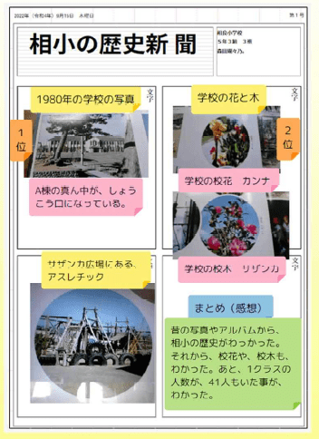 一方、「相小の歴史新聞」は、5年3組ふるさと科「だから大好き相良小!~相良小150周年をひも解こう~」に合わせて作成しているものです。