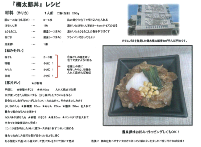 5年生が朝霧自然体験教室に行ってきました。でっかい富士山の麓で、ハイキング、ニジマス釣り、ナイトウォーク、乳搾り体験など、みんなで楽しく、仲良く活動をしました。学校では気づくことができない宝物も、たくさん見つけました【写真左】。民宿大沢さんの全面協力をいただき、5年生が考えた鈴木梅太郎丼が完成しました。ビタミンB1たっぷりのおいしい丼です。梅みそタレが豚肉によくあい、もりもり食べられる丼です【写真右】。この丼を入口にして、鈴木梅太郎博士をもっといろんな人に知ってもらいたいと思います。