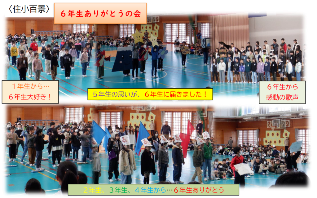 3月4日、6年生ありがとうの会が行われました。最高学年として下級生の良いお手本となってきた6年生に感謝の気持ちを表そうと、5年生が中心となって準備を進め、当日は、全校児童の思いが一つになった心温まる会になりました。