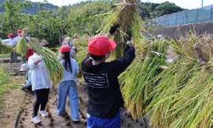 5年生・・・9月9日に稲刈りをしました。6月に田植えをした時には小さかった苗が、大きく育ちたくさんの稲穂が実りました。とても暑い日で、汗びっしょりになってがんばりました。