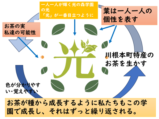 9年生が考案したデザインから、児童生徒、教職員による投票と、学習発表会の際に行った保護者の皆様による投票の結果、以下のような校章に決定しました。川根本町の自慢の1つであるお茶と、光の森学園の子供たち一人一人の輝きを表した素敵なデザインです。この校章を、地域の方と共にみんなで大切にしていきたいとのことです。