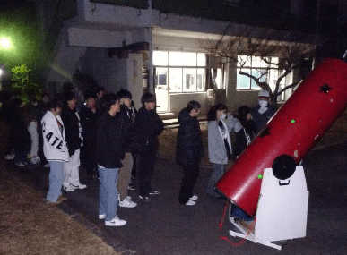 県大会を勝ち抜いた女子ソフトテニス部が12月27日(金)・28日(土)に三重県四日市市で行われた「第28回ミズノ東海ジュニア選抜ソフトテニス大会」に出場しました。個人戦・団体戦とも惜しくも予選リーグ敗退でしたが、他県の強豪チームと対戦でき、何物にも代えがたい貴重な経験を積むことができました【写真左:開会式の様子】。また、12月 26 日( 木 )夜 、地域の方のご協力のもと、天体観測会が開かれました。今年は3年生を中心に50名ほどの生徒が参加し、テレビや教科書等でしか見たことのなかった木星が望遠鏡を通してはっきり見えるなど、感動を伴った観測会になりました【写真右:巨大望遠鏡での観測の様子】。