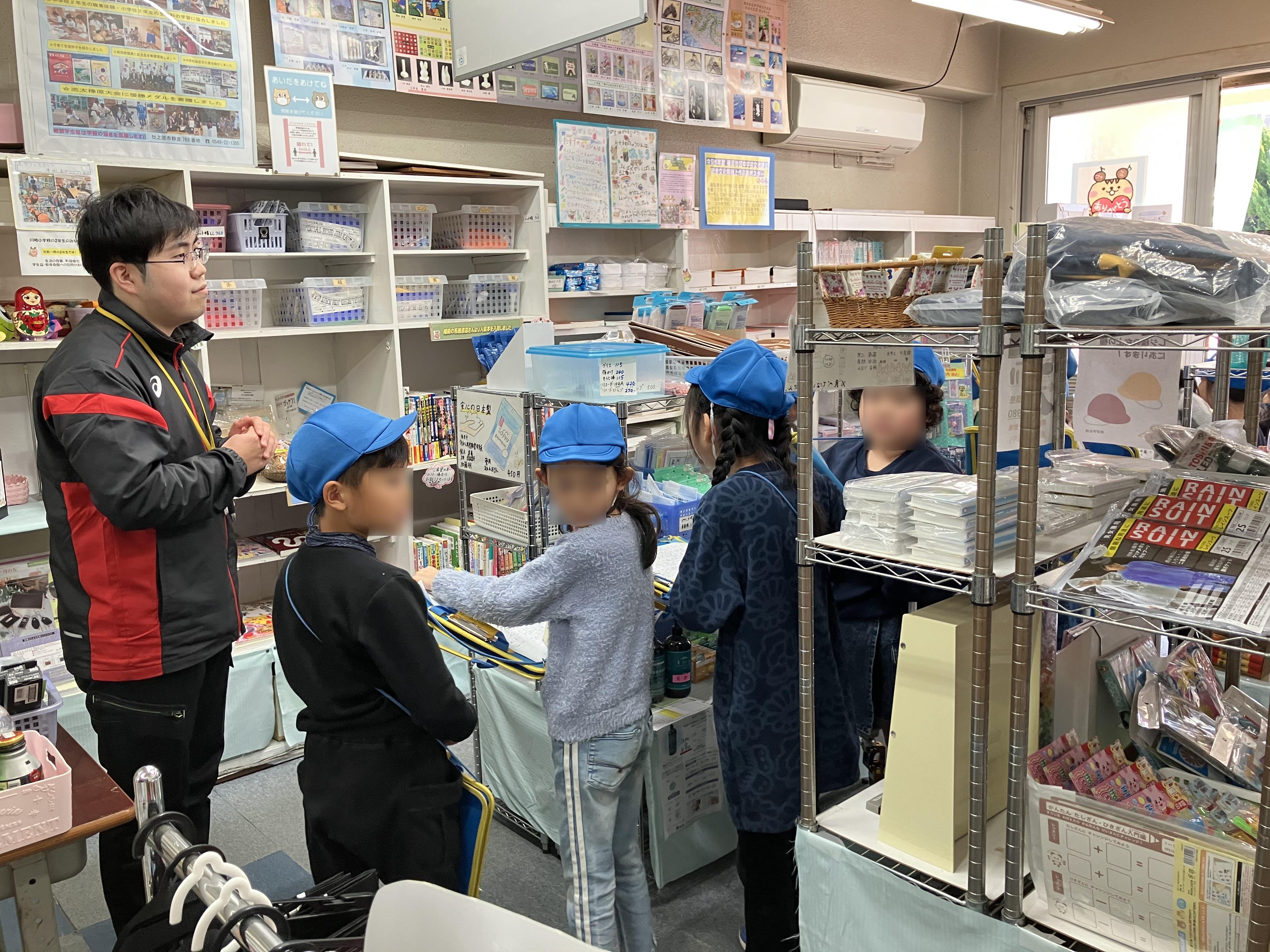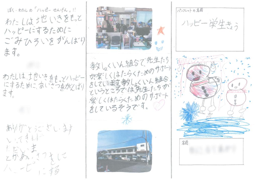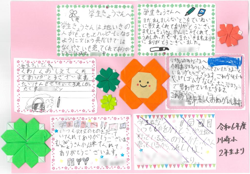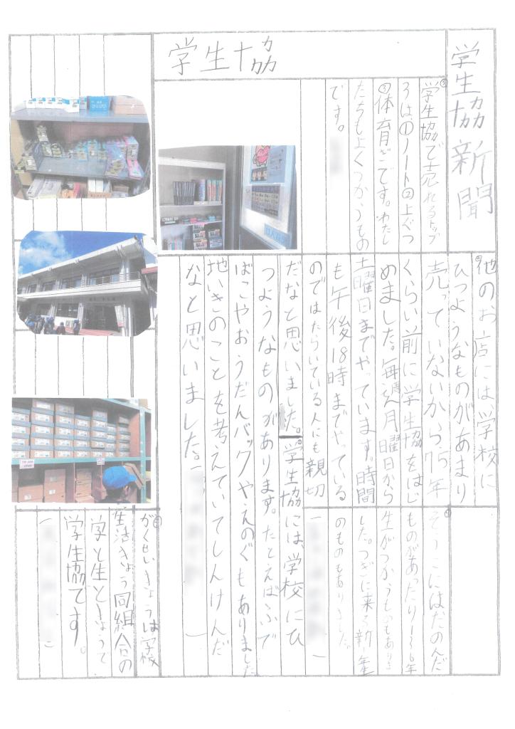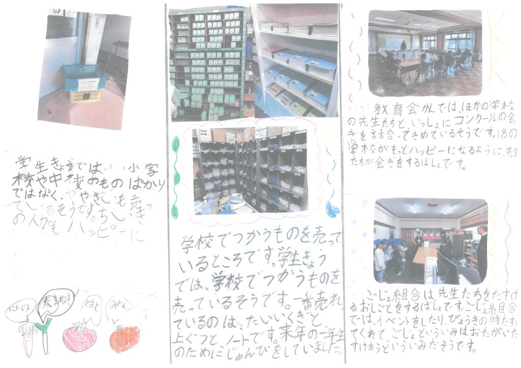 川崎小学校2年生の皆さんが、1月24日に榛原学生協を訪問【写真上段右の上下】し、学生協や教育会館について調べてまとめてくれました。そして、2月14日の授業参観会で発表し保護者の皆さんに説明してくれました【写真上段左】。さらに、その内容を新聞や掲示物にまとめたもの【写真中下段】を、榛原学生協に届けてくださいました。とてもくわしくていねいにまとめてあり感謝の気持ちでいっぱいです。川崎小学校2年生の皆さん本当にありがとうございました。