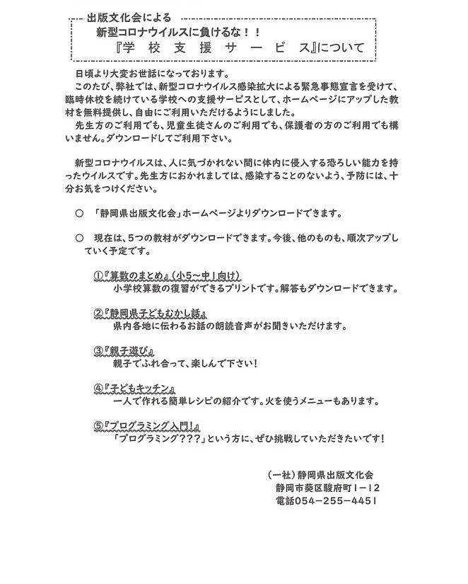 図書教材を発行している静岡県出版文化会から学校、保護者への支援サービスとしてダウンロードコンテンツの情報です。下記に詳細やアドレス・QRコードを掲載いたします。