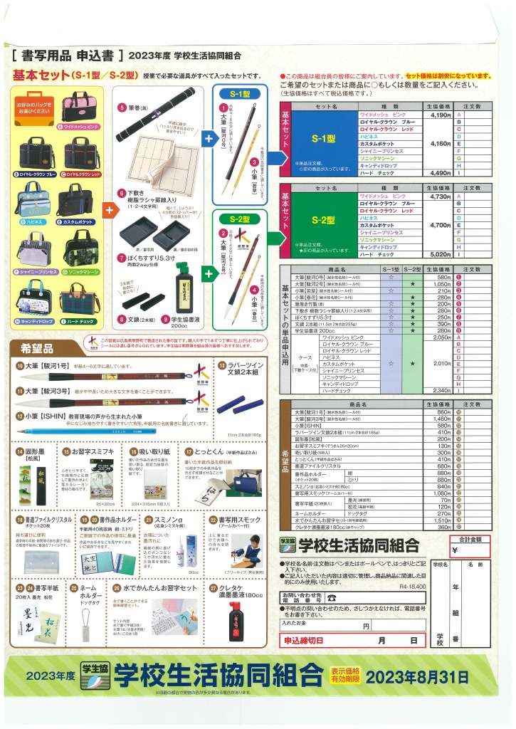 各校に注文封筒をお分けしてありますが、買い忘れた物や足りない物品は売店にあります。