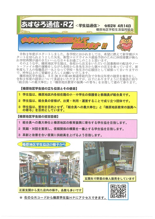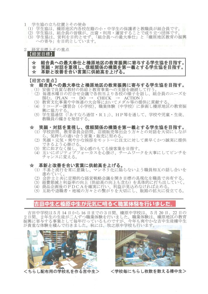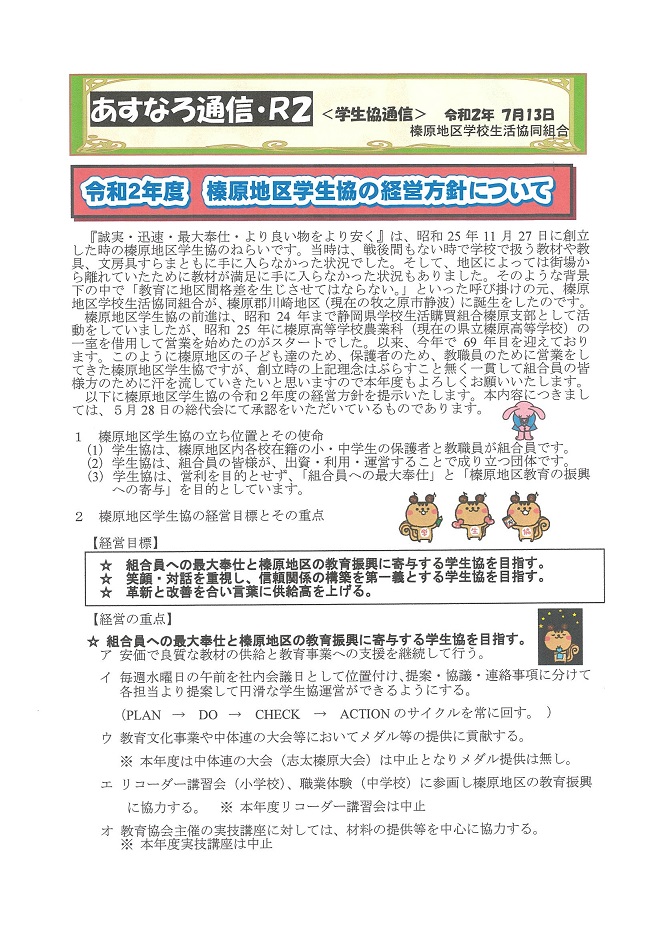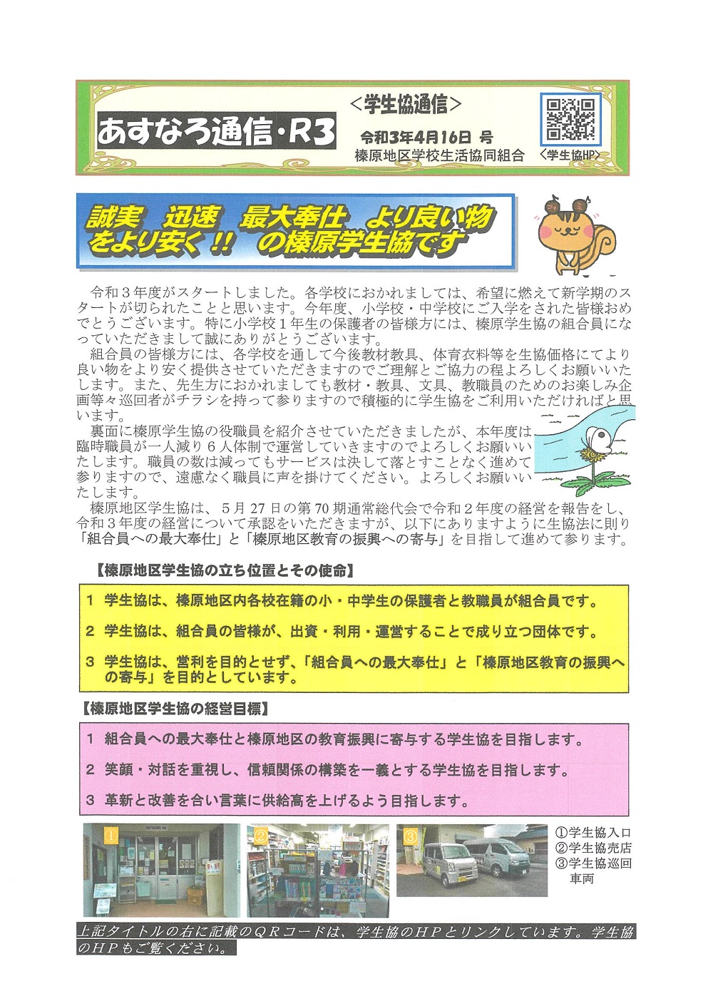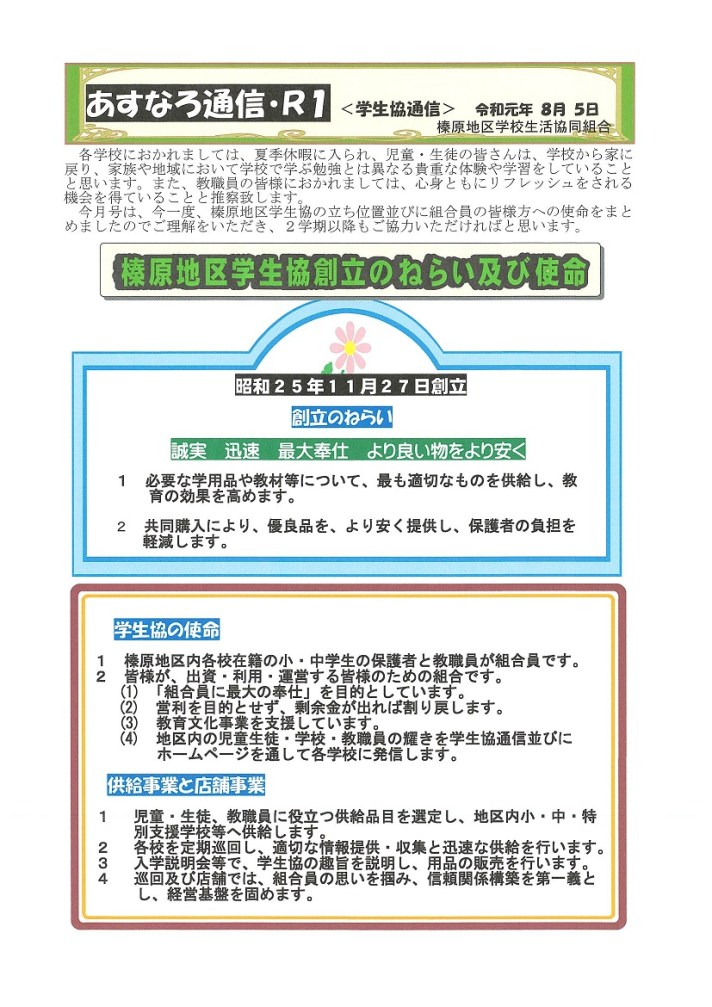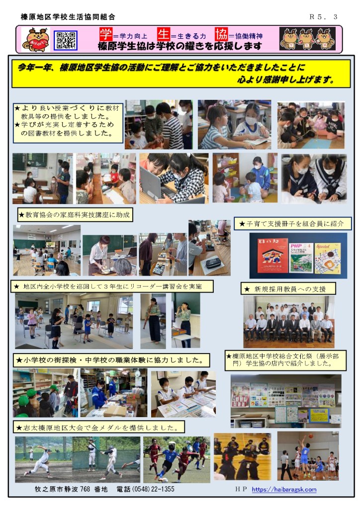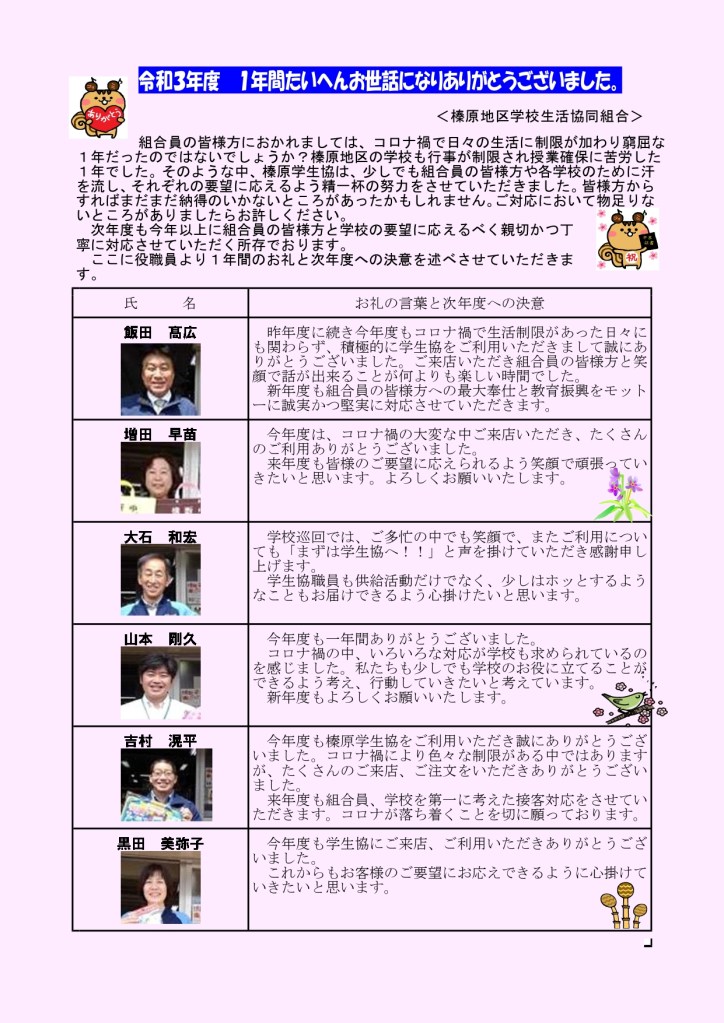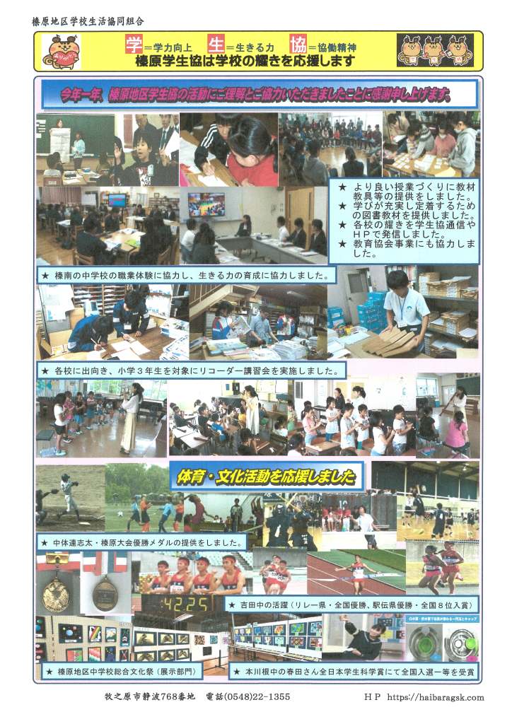 榛原地区学生協には、本年度1年間ご愛顧の程、誠にありがとうございました。ここに榛原学生協が歩んだ1年間を誌面で振り返りたいと思います。御連絡ありがとうございました。ご承知の通り、榛原地区学生協はものを売るだけでなくそれぞれの学校に寄り添い、学校のため、児童・生徒のため、保護者のため、教職員のために仕事をし、汗を流すことを使命と考え取り組んでいます。このことが少しでもご理解いただけたならと思います。次年度も役職員一同力を合わせて使命を忘れず一生懸命取り組んでまいりますのでよろしくよろしくお願い致します。