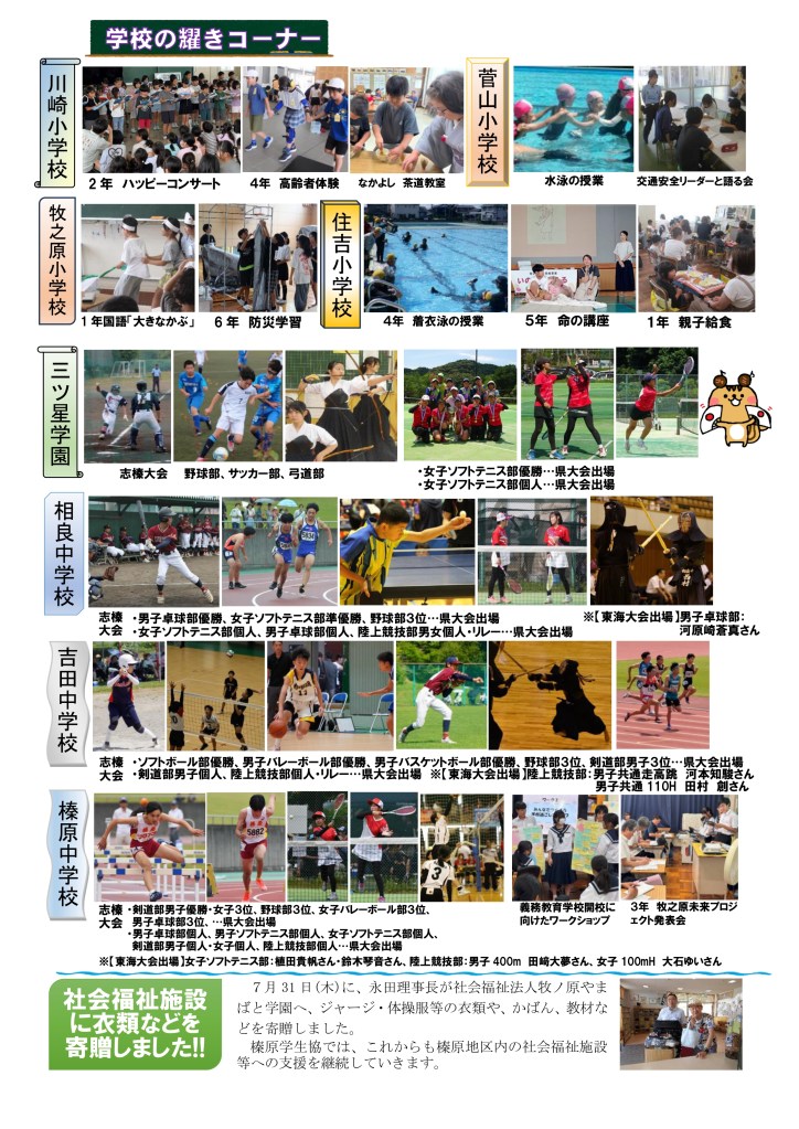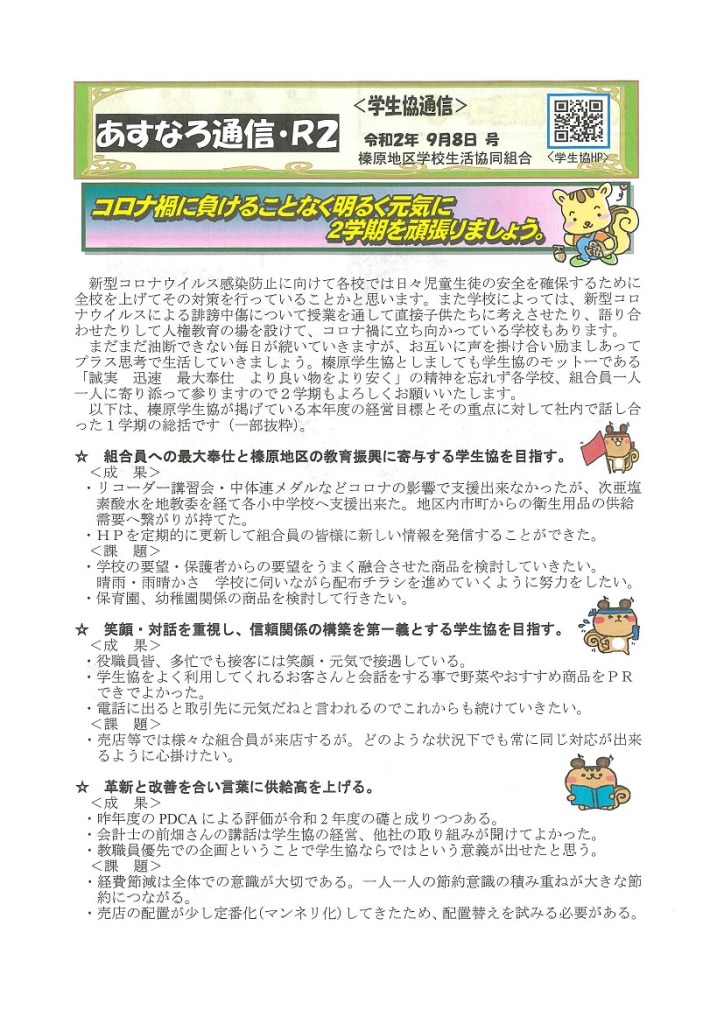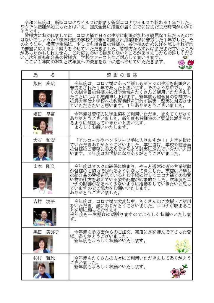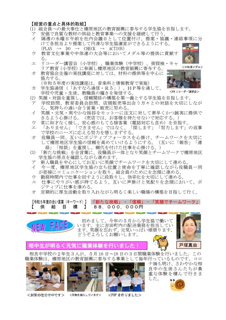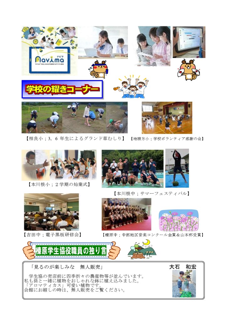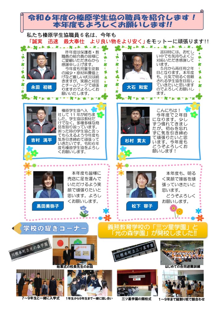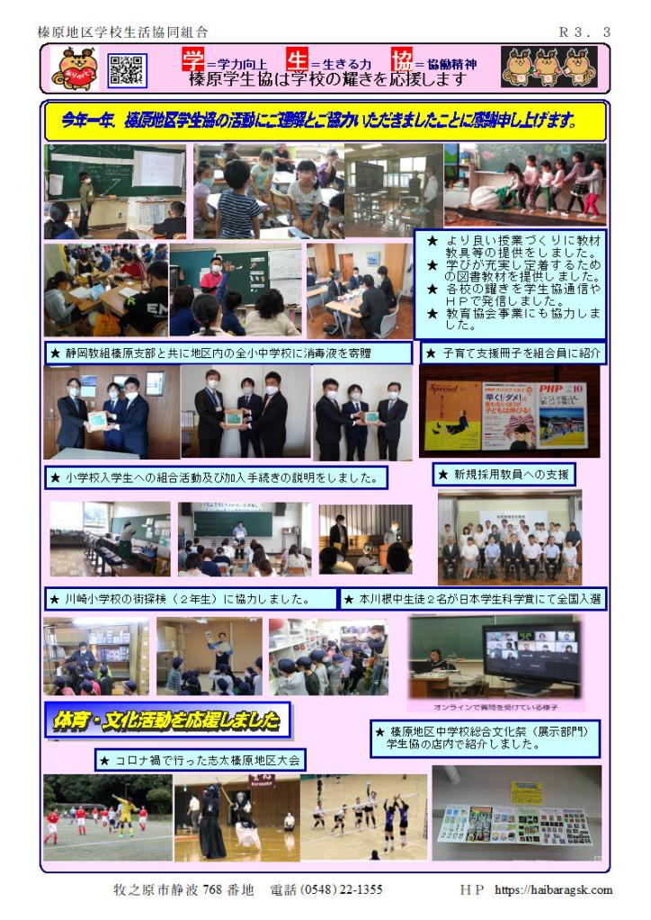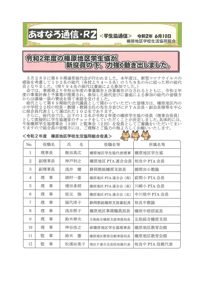 榛原地区学生協には、本年度1年間ご愛顧の程、誠にありがとうございました。ここに榛原学生協が歩んだ1年間を誌面で振り返りたいと思います。御連絡ありがとうございました。ご承知の通り、榛原地区学生協はものを売るだけでなくそれぞれの学校に寄り添い、学校のため、児童・生徒のため、保護者のため、教職員のために仕事をし、汗を流すことを使命と考え取り組んでいます。このことが少しでもご理解いただけたならと思います。次年度も役職員一同力を合わせて使命を忘れず一生懸命取り組んでまいりますのでよろしくよろしくお願い致します。