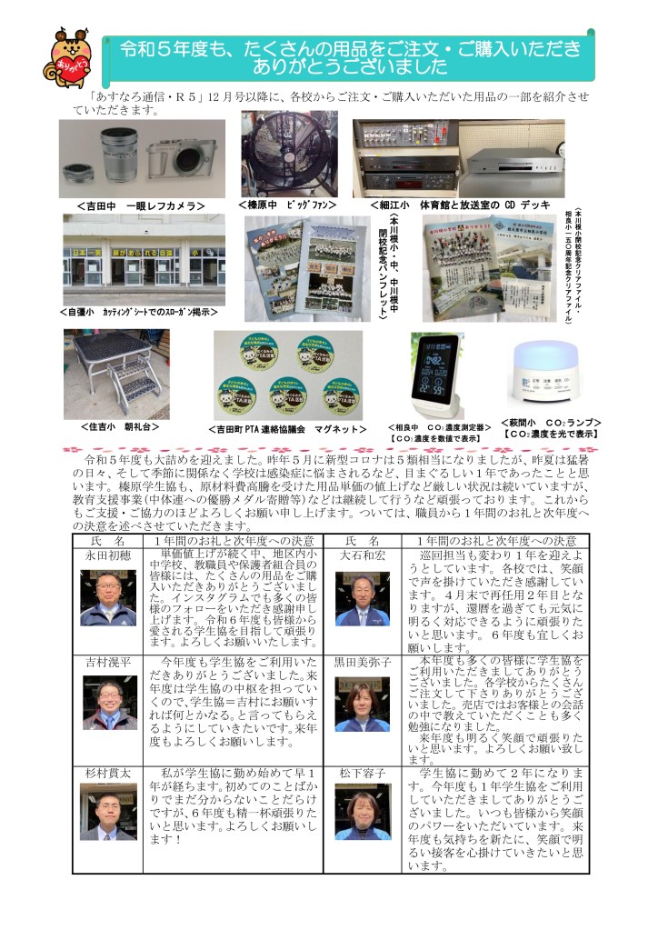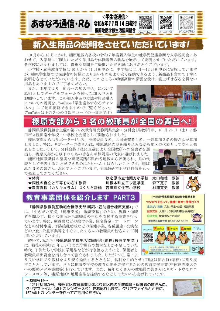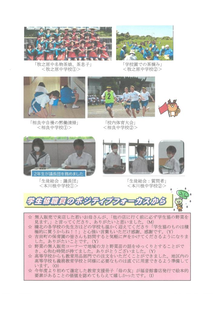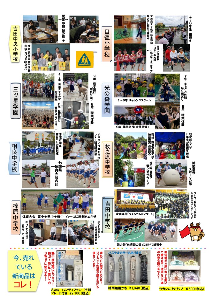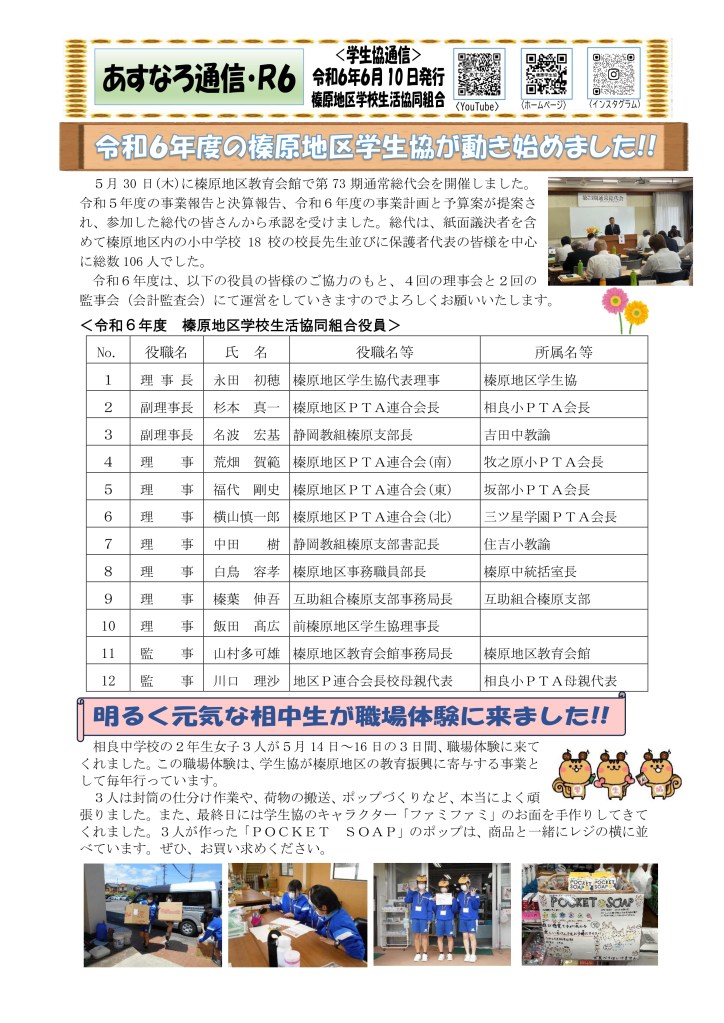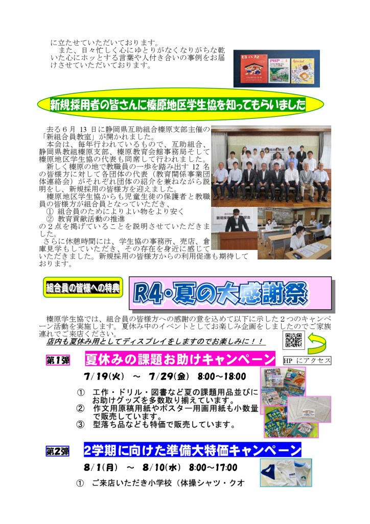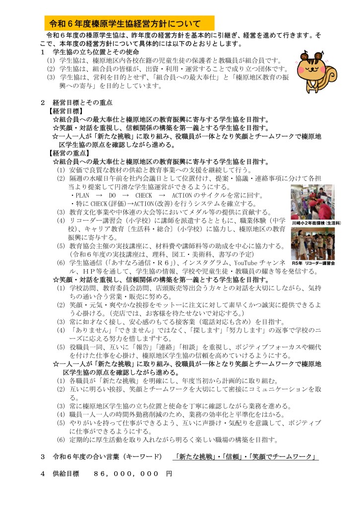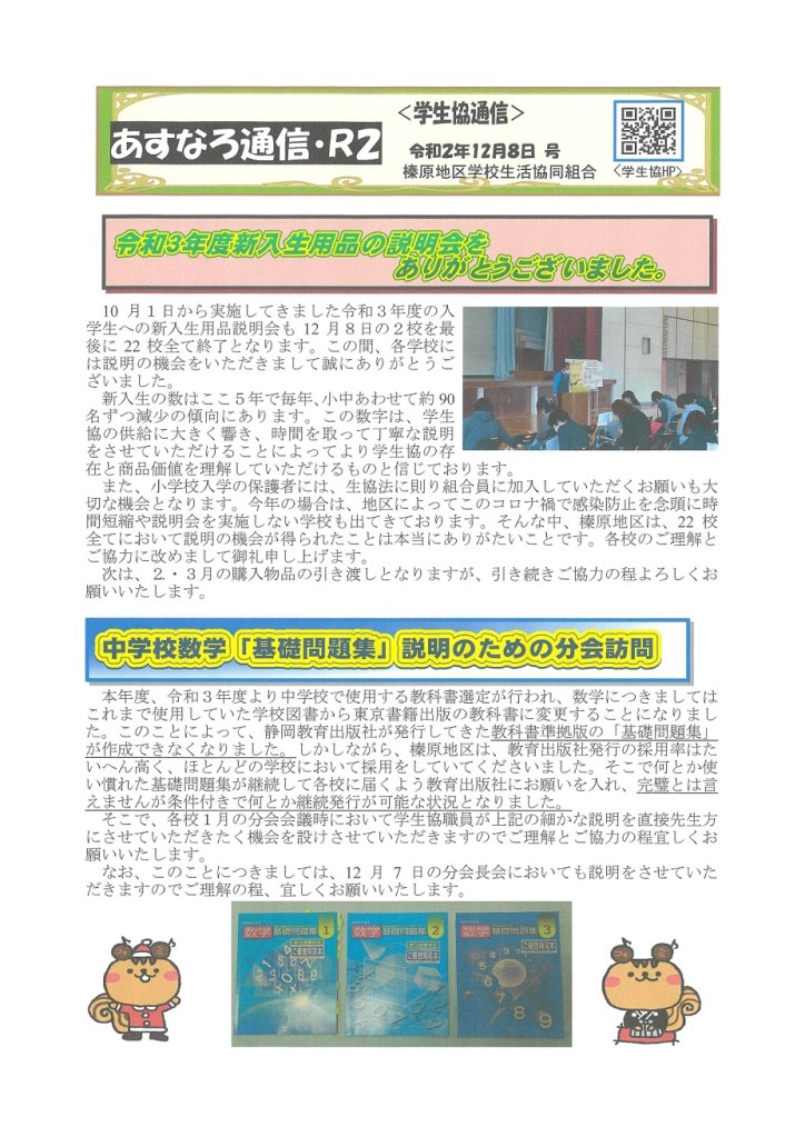 榛原地区学生協には、本年度1年間ご愛顧の程、誠にありがとうございました。ここに榛原学生協が歩んだ1年間を誌面で振り返りたいと思います。御連絡ありがとうございました。ご承知の通り、榛原地区学生協はものを売るだけでなくそれぞれの学校に寄り添い、学校のため、児童・生徒のため、保護者のため、教職員のために仕事をし、汗を流すことを使命と考え取り組んでいます。このことが少しでもご理解いただけたならと思います。次年度も役職員一同力を合わせて使命を忘れず一生懸命取り組んでまいりますのでよろしくよろしくお願い致します。