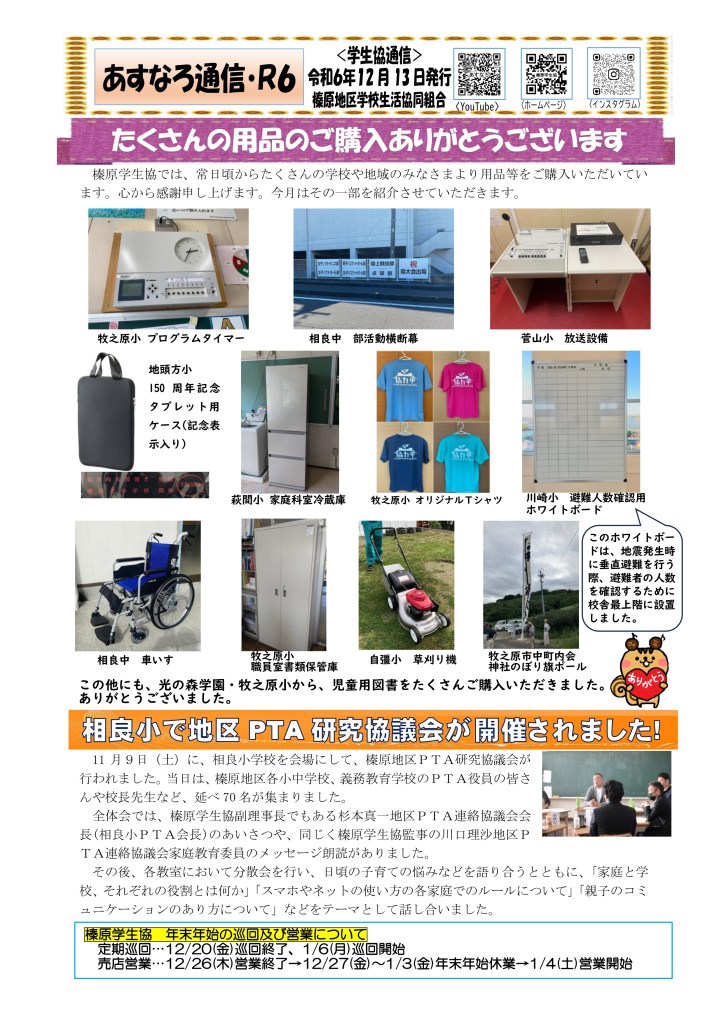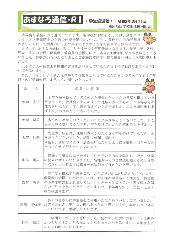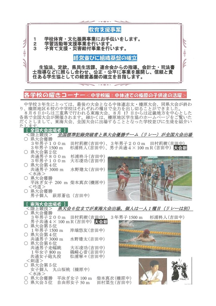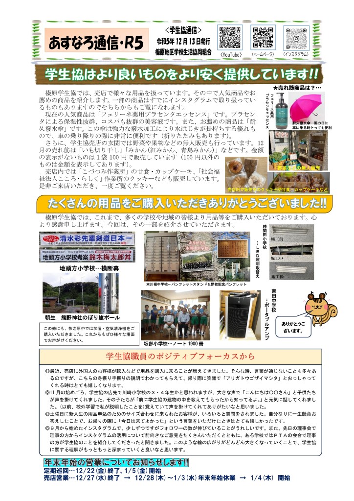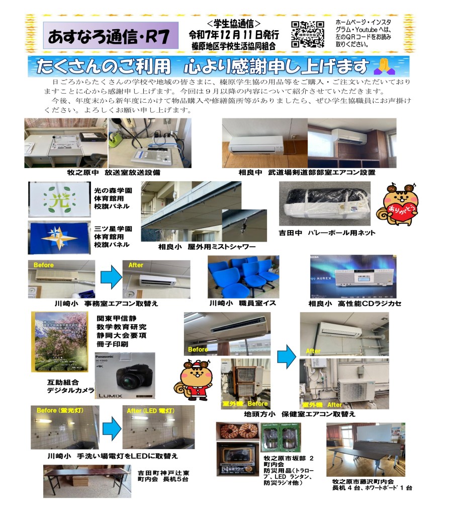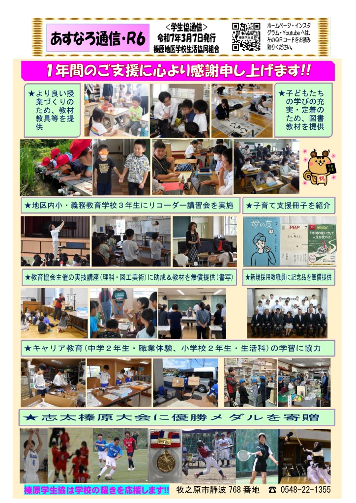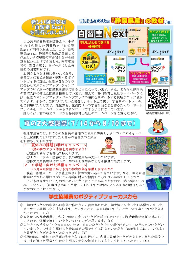 榛原地区学生協には、本年度1年間ご愛顧の程、誠にありがとうございました。ここに榛原学生協が歩んだ1年間を誌面で振り返りたいと思います。御連絡ありがとうございました。ご承知の通り、榛原地区学生協はものを売るだけでなくそれぞれの学校に寄り添い、学校のため、児童・生徒のため、保護者のため、教職員のために仕事をし、汗を流すことを使命と考え取り組んでいます。このことが少しでもご理解いただけたならと思います。次年度も役職員一同力を合わせて使命を忘れず一生懸命取り組んでまいりますのでよろしくよろしくお願い致します。