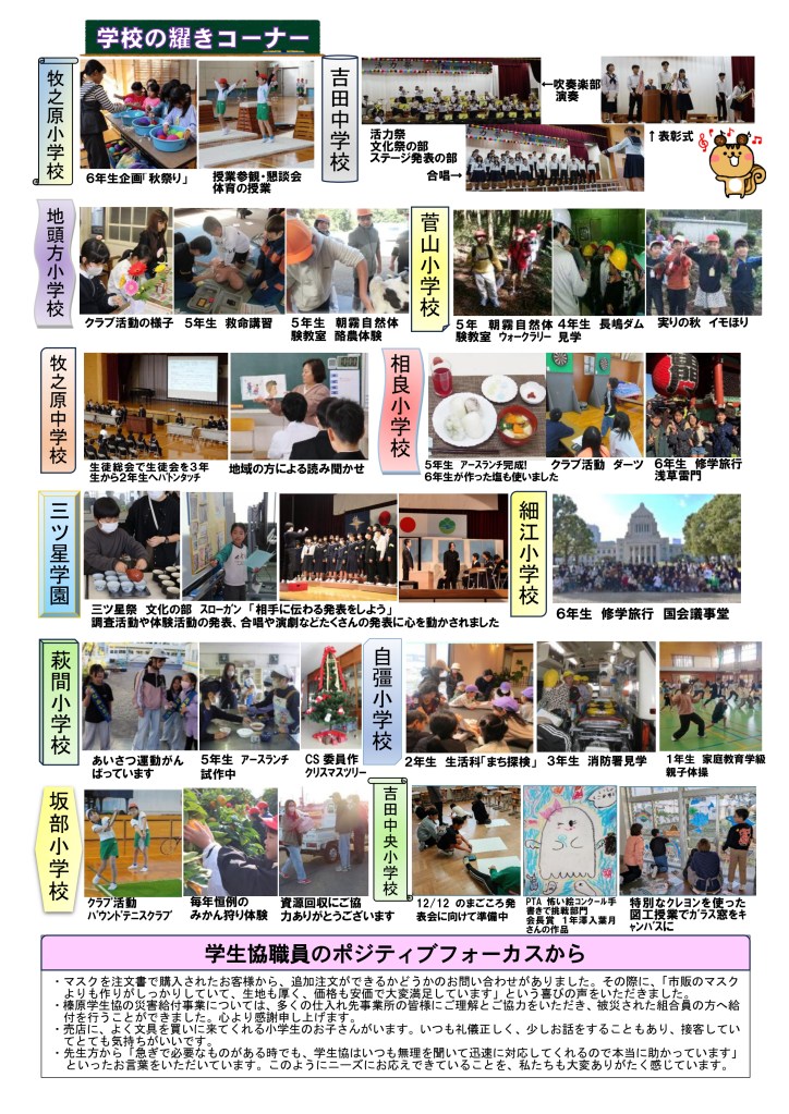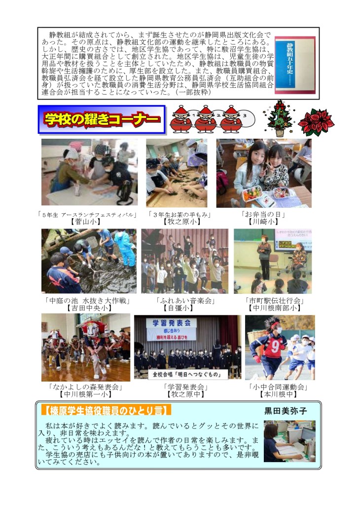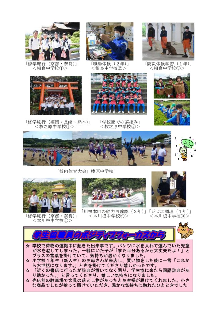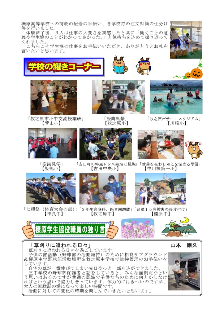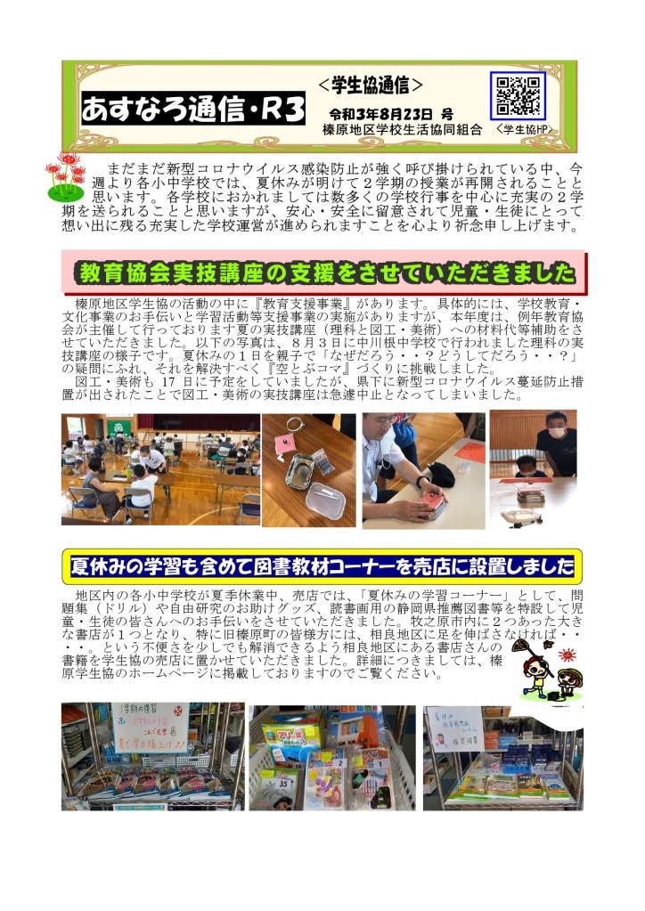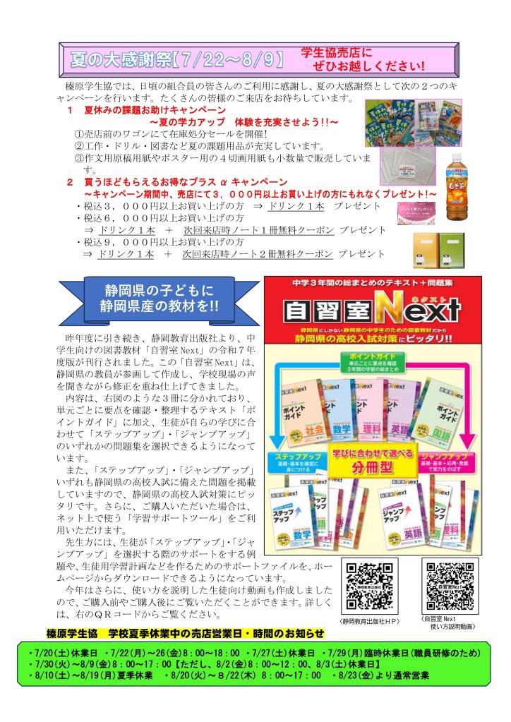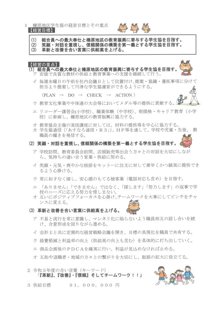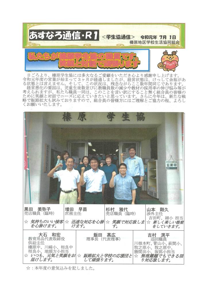 榛原地区学生協には、本年度1年間ご愛顧の程、誠にありがとうございました。ここに榛原学生協が歩んだ1年間を誌面で振り返りたいと思います。御連絡ありがとうございました。ご承知の通り、榛原地区学生協はものを売るだけでなくそれぞれの学校に寄り添い、学校のため、児童・生徒のため、保護者のため、教職員のために仕事をし、汗を流すことを使命と考え取り組んでいます。このことが少しでもご理解いただけたならと思います。次年度も役職員一同力を合わせて使命を忘れず一生懸命取り組んでまいりますのでよろしくよろしくお願い致します。