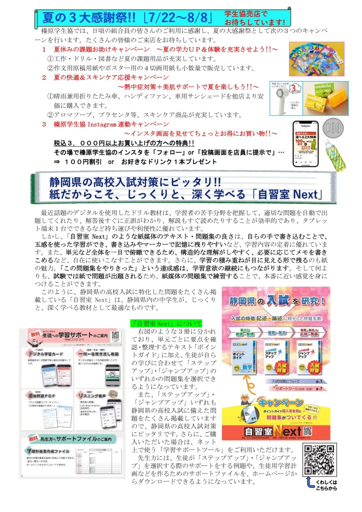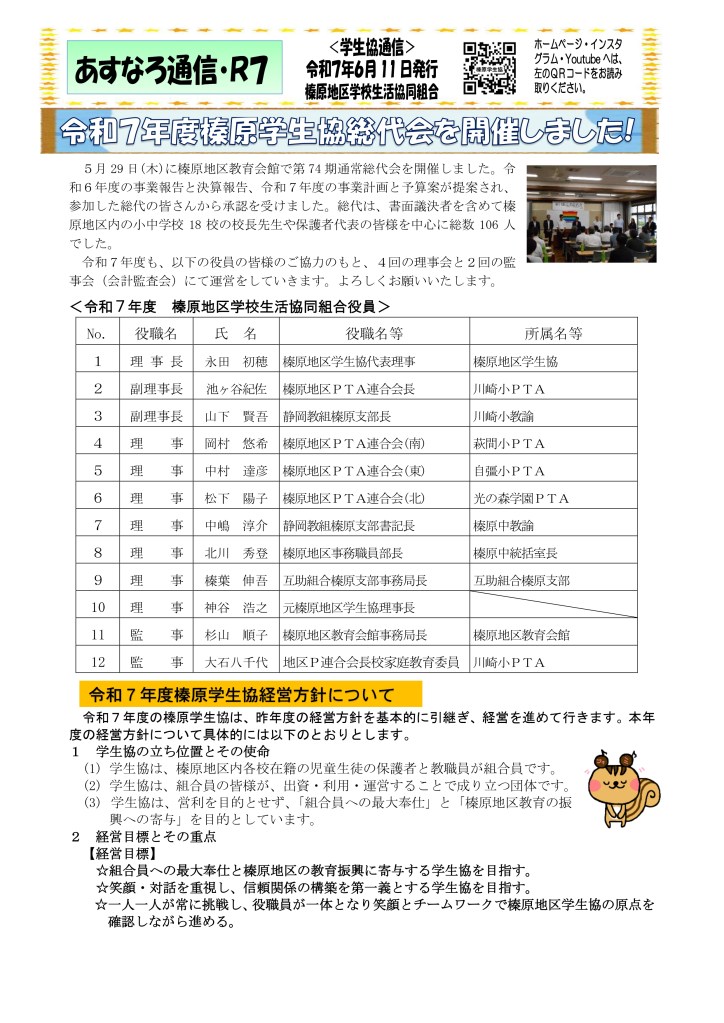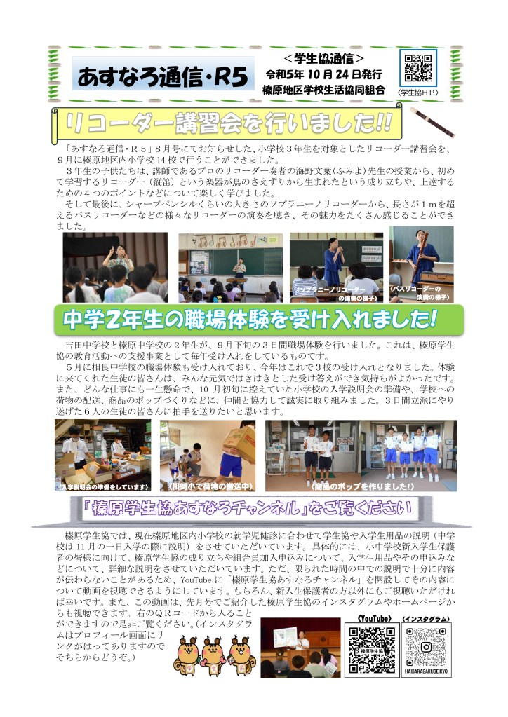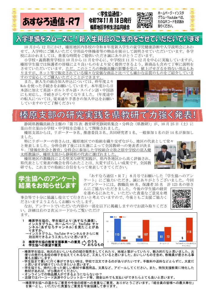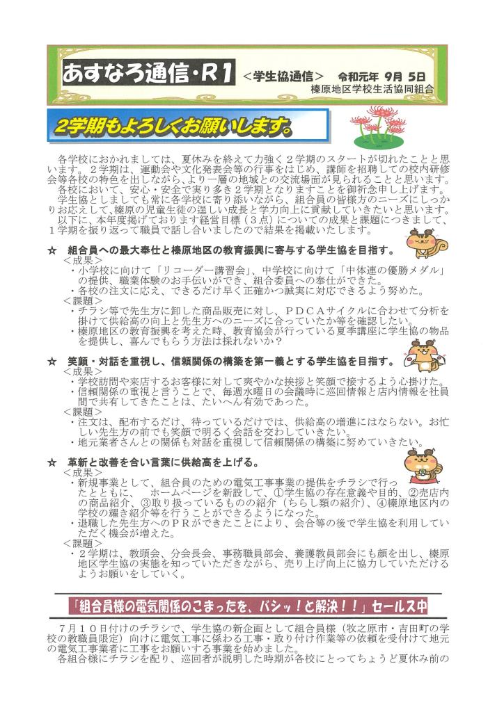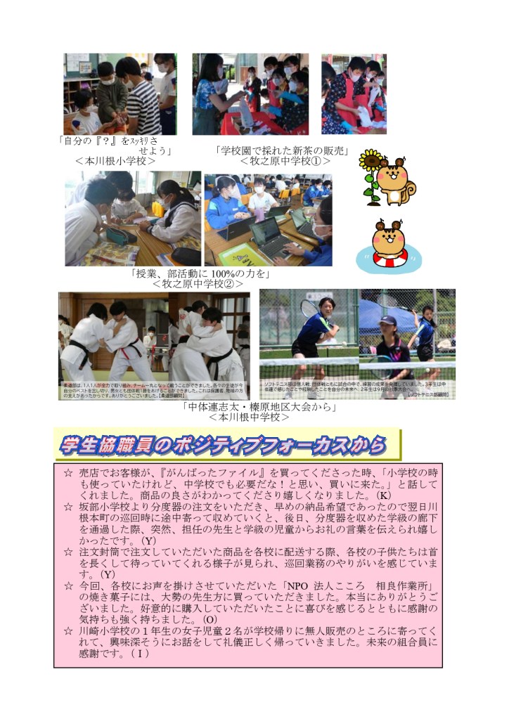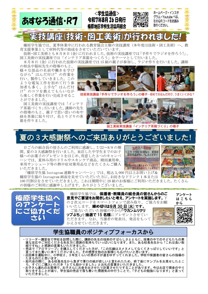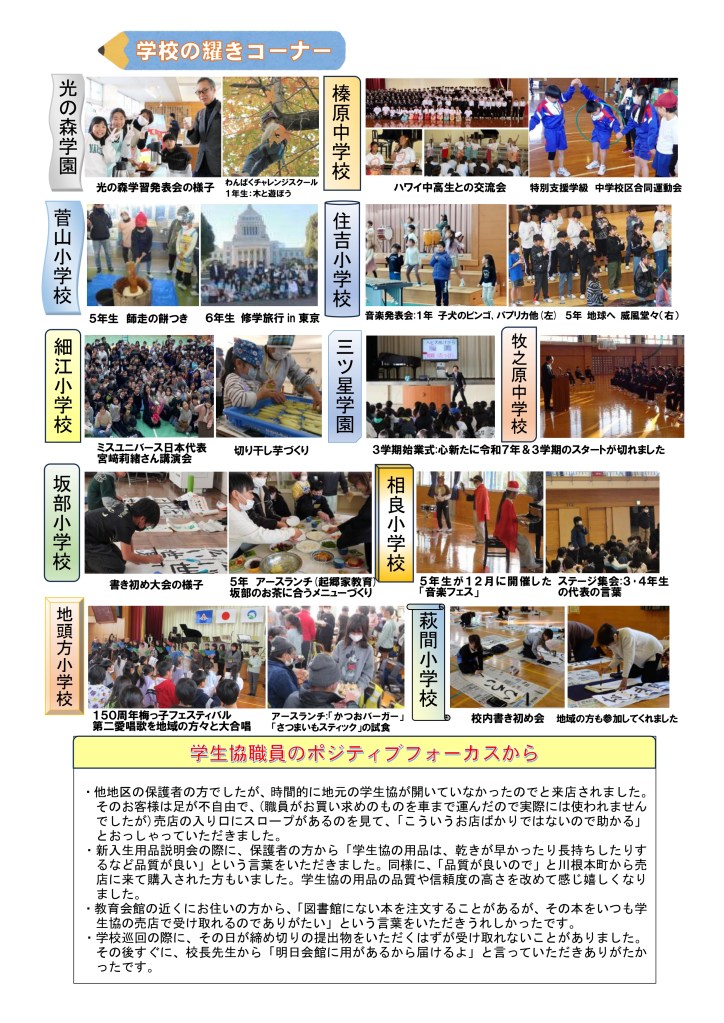榛原地区学生協には、本年度1年間ご愛顧の程、誠にありがとうございました。ここに榛原学生協が歩んだ1年間を誌面で振り返りたいと思います。御連絡ありがとうございました。ご承知の通り、榛原地区学生協はものを売るだけでなくそれぞれの学校に寄り添い、学校のため、児童・生徒のため、保護者のため、教職員のために仕事をし、汗を流すことを使命と考え取り組んでいます。このことが少しでもご理解いただけたならと思います。次年度も役職員一同力を合わせて使命を忘れず一生懸命取り組んでまいりますのでよろしくよろしくお願い致します。