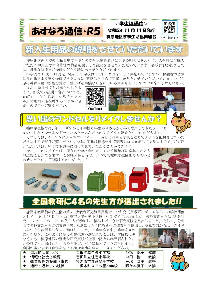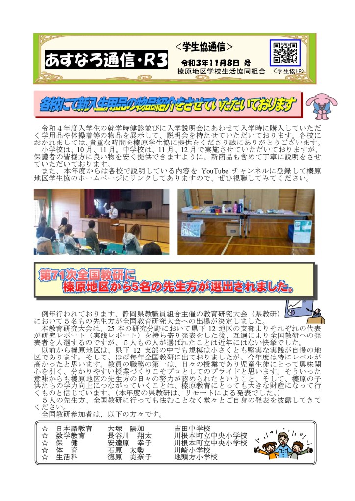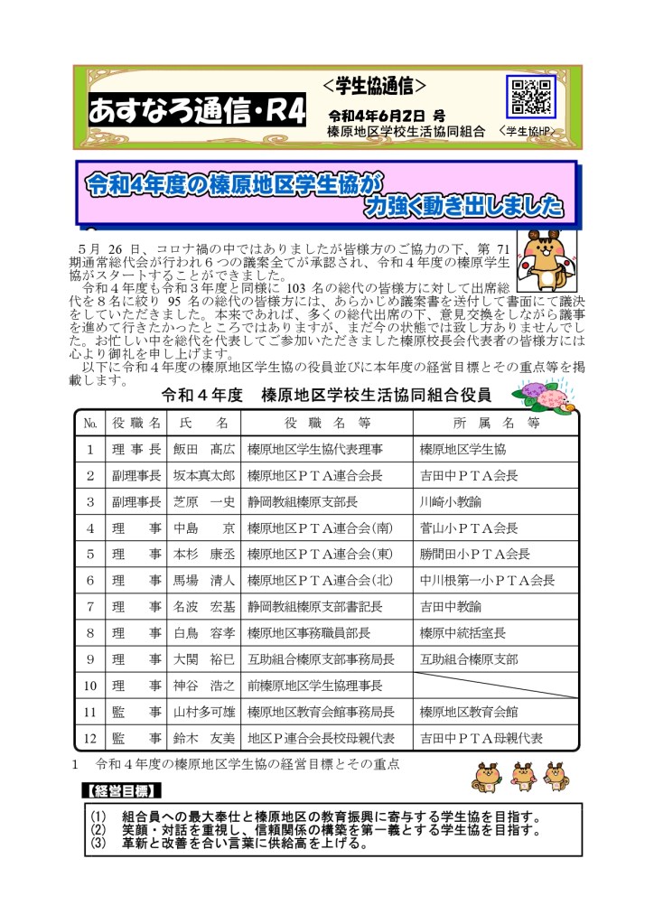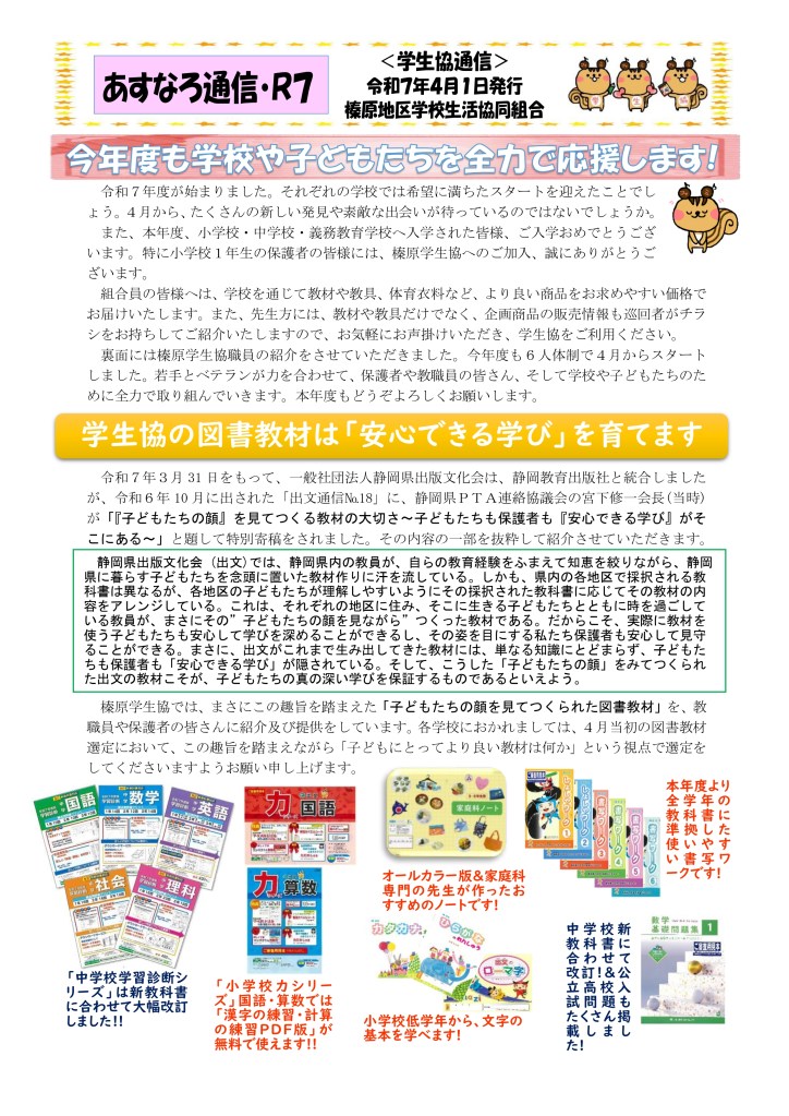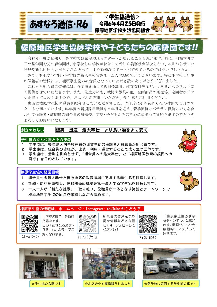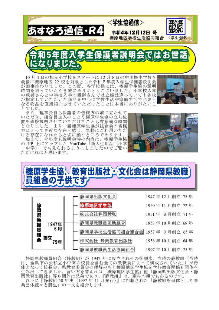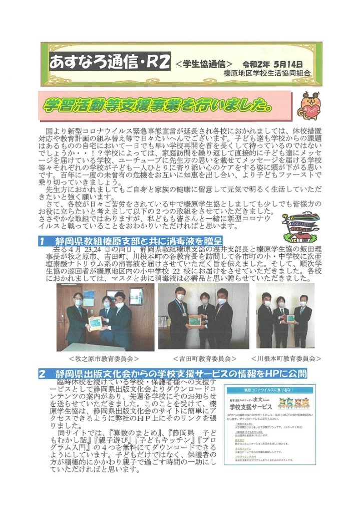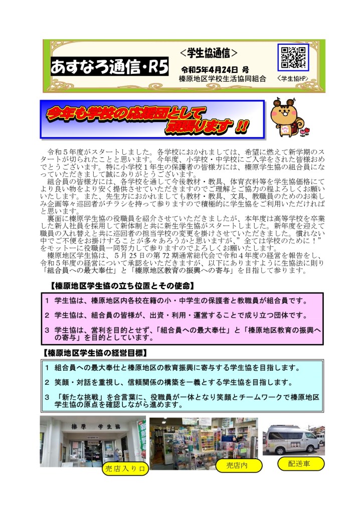 令和4年度がスタートしました。今年度も昨年度と同様に「各学校の輝き」を満載した学生協便り(「あすなろ通信・R4])を毎月本ページに掲載して行きます。榛原地区学生協は、単に物品を販売するだけではなく各学校、組合員の皆様方の応援団として「より良いものをより安く」「教育貢献」「地域貢献」を目指して取り組んでまいりますのでよろしくお願いいたします。