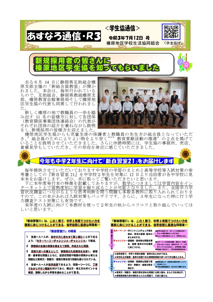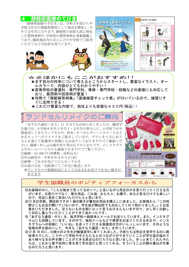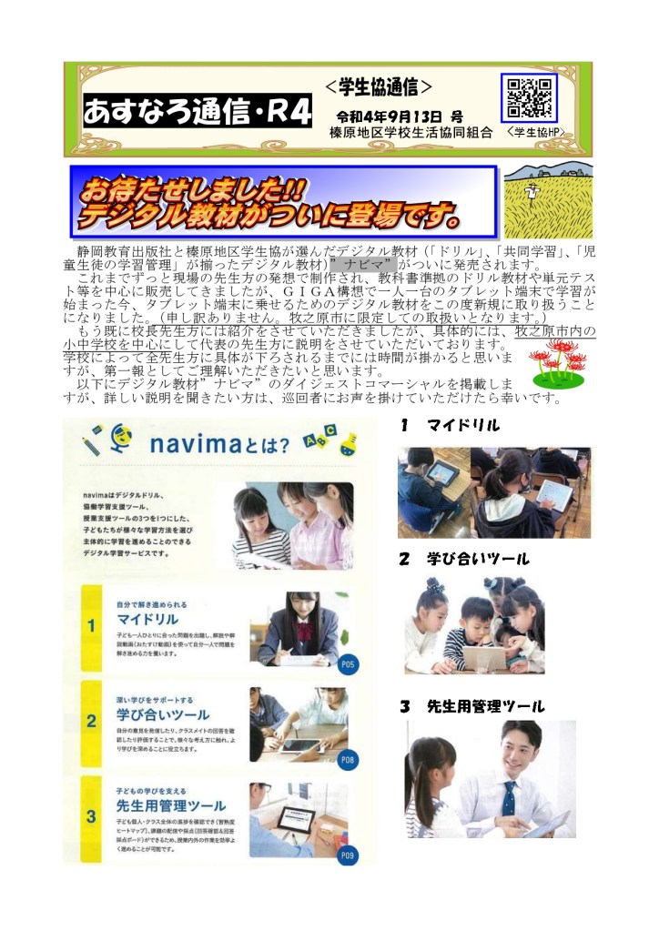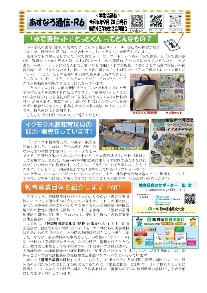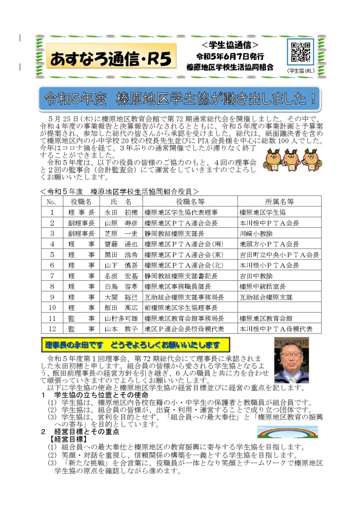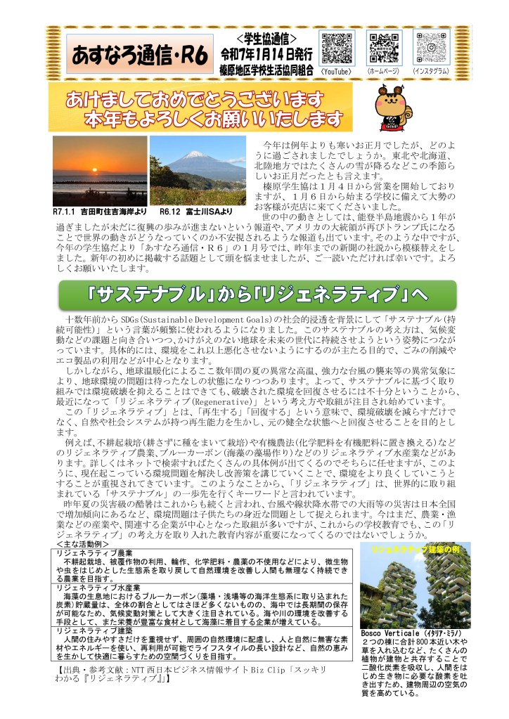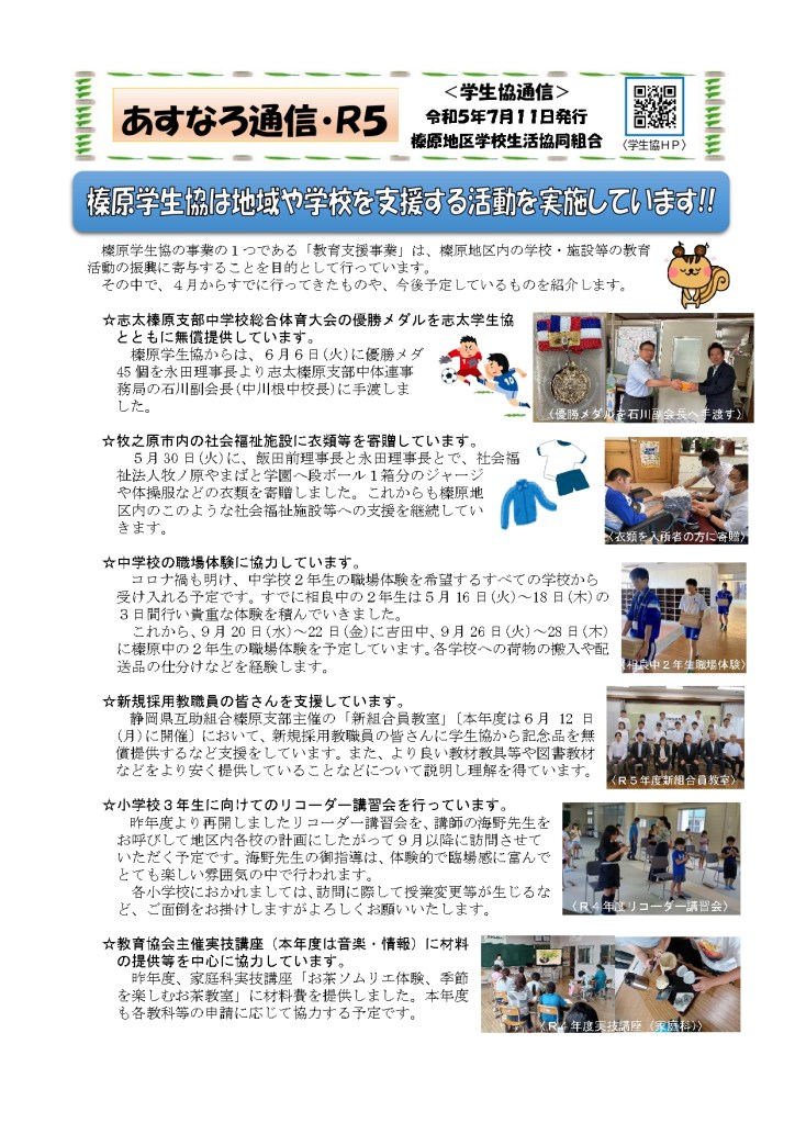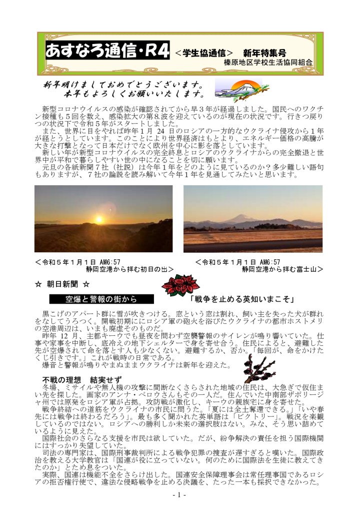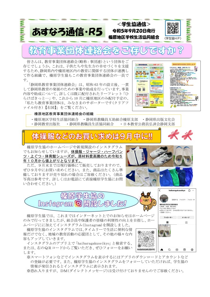 令和4年度がスタートしました。今年度も昨年度と同様に「各学校の輝き」を満載した学生協便り(「あすなろ通信・R4])を毎月本ページに掲載して行きます。榛原地区学生協は、単に物品を販売するだけではなく各学校、組合員の皆様方の応援団として「より良いものをより安く」「教育貢献」「地域貢献」を目指して取り組んでまいりますのでよろしくお願いいたします。